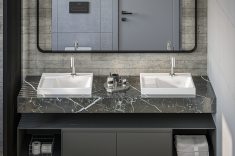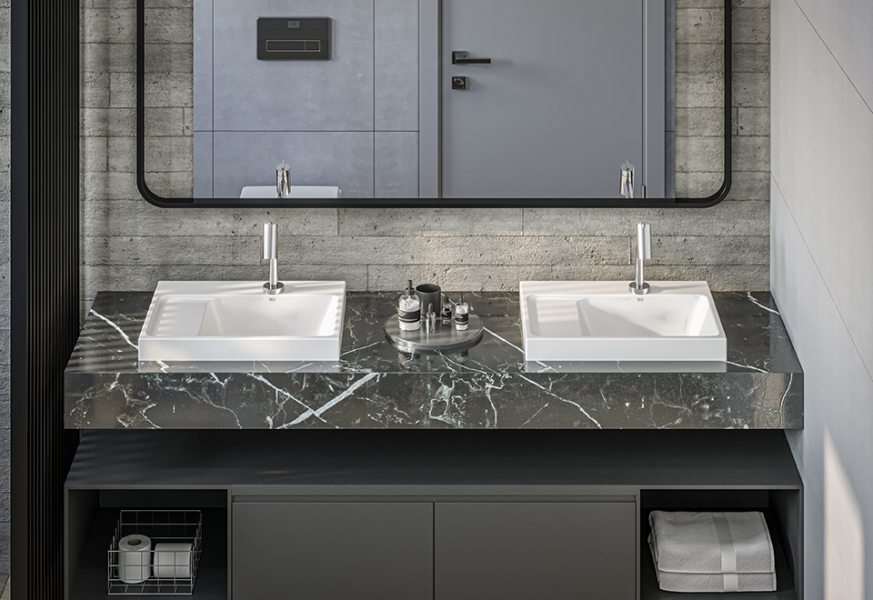 Acima: Na bancada de casal, a dupla de cubas de sobrepor da linha Optica L50 (500 x 380 mm*) está na cor branco brilho | Foto: Divulgação Roca