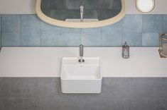 Os formatos geométricos marcam esse banheiro com a cuba de apoio da linha Optica (450 x 300 mm*) na cor branco brilho, da Roca | Foto: Divulgação Roca