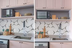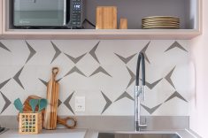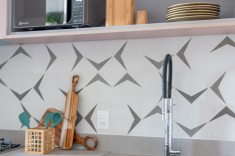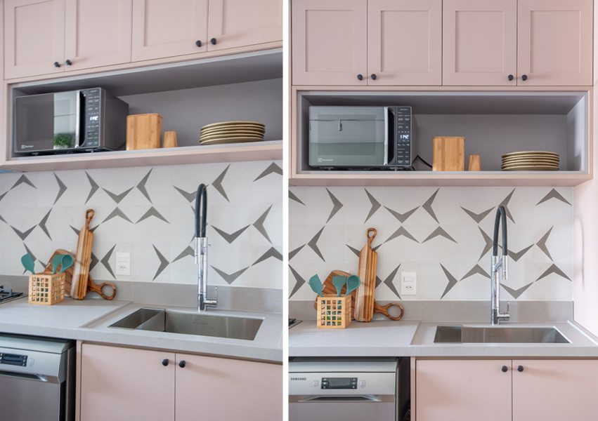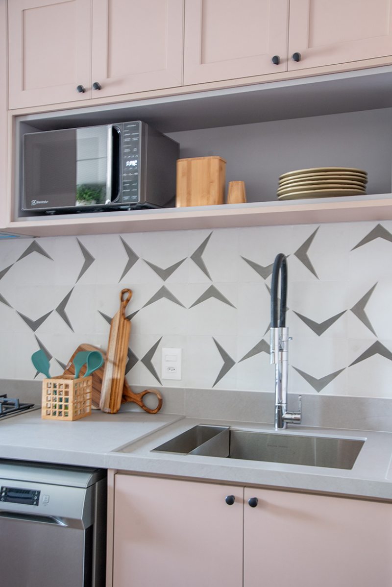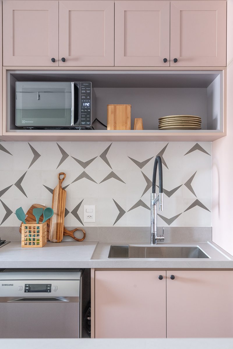 Quando a arquiteta Mari Milani afirma que o rosa está pronto para figurar em todos os cômodos da casa, ela não está exagerando. Nesse apartamento compacto com cozinha integrada, ela não só apostou no tom clarinho para a marcenaria, como também no piso em porcelanato, formato 90x90. A graciosidade foi completada pelo cinza claro que envolve o nicho do micro-ondas.