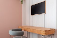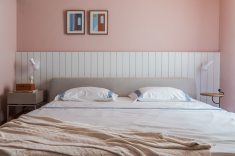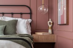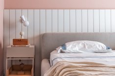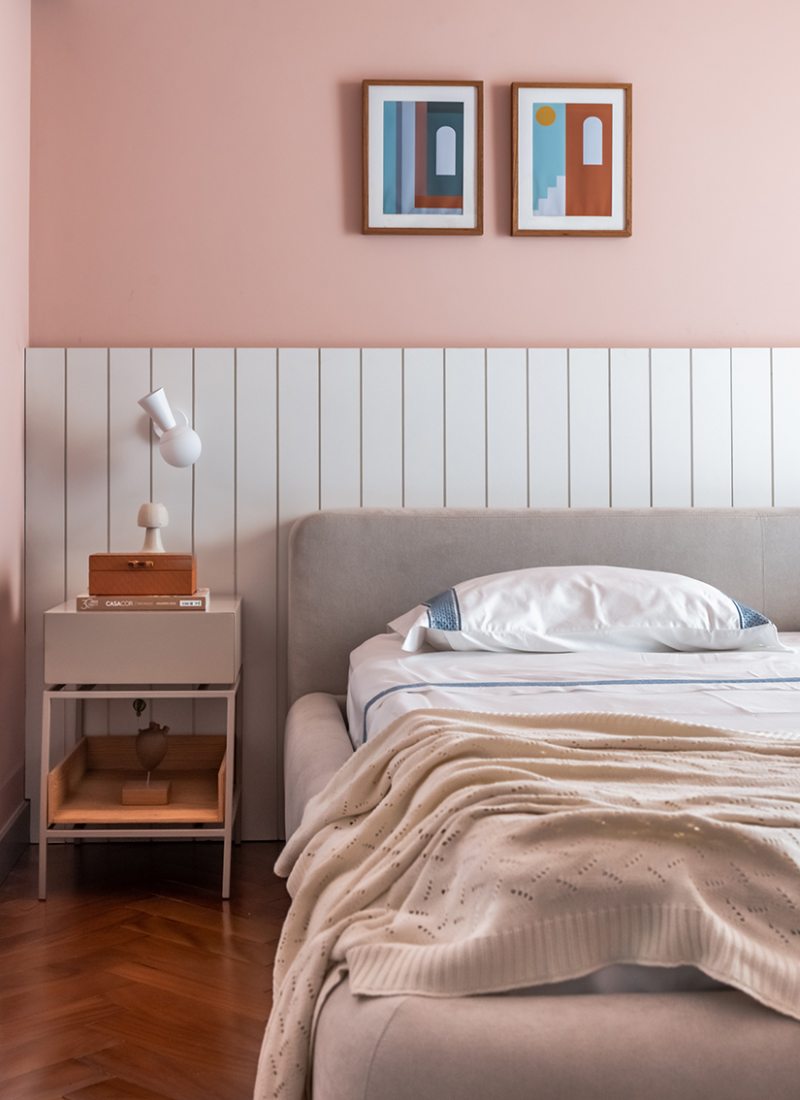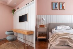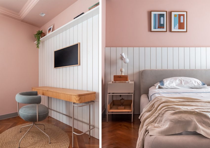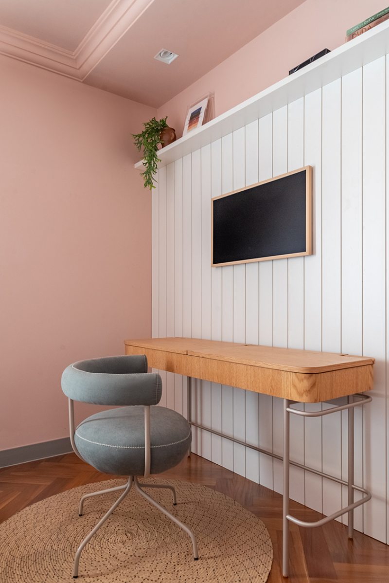 No home office acima, a mesa tanto é usada para as atividades profissionais como uma penteadeira. O painel ripado branco demarcou a finalidade desse cantinho dentro do dormitório com paredes rosa.