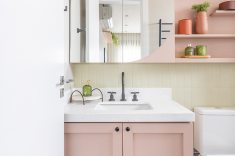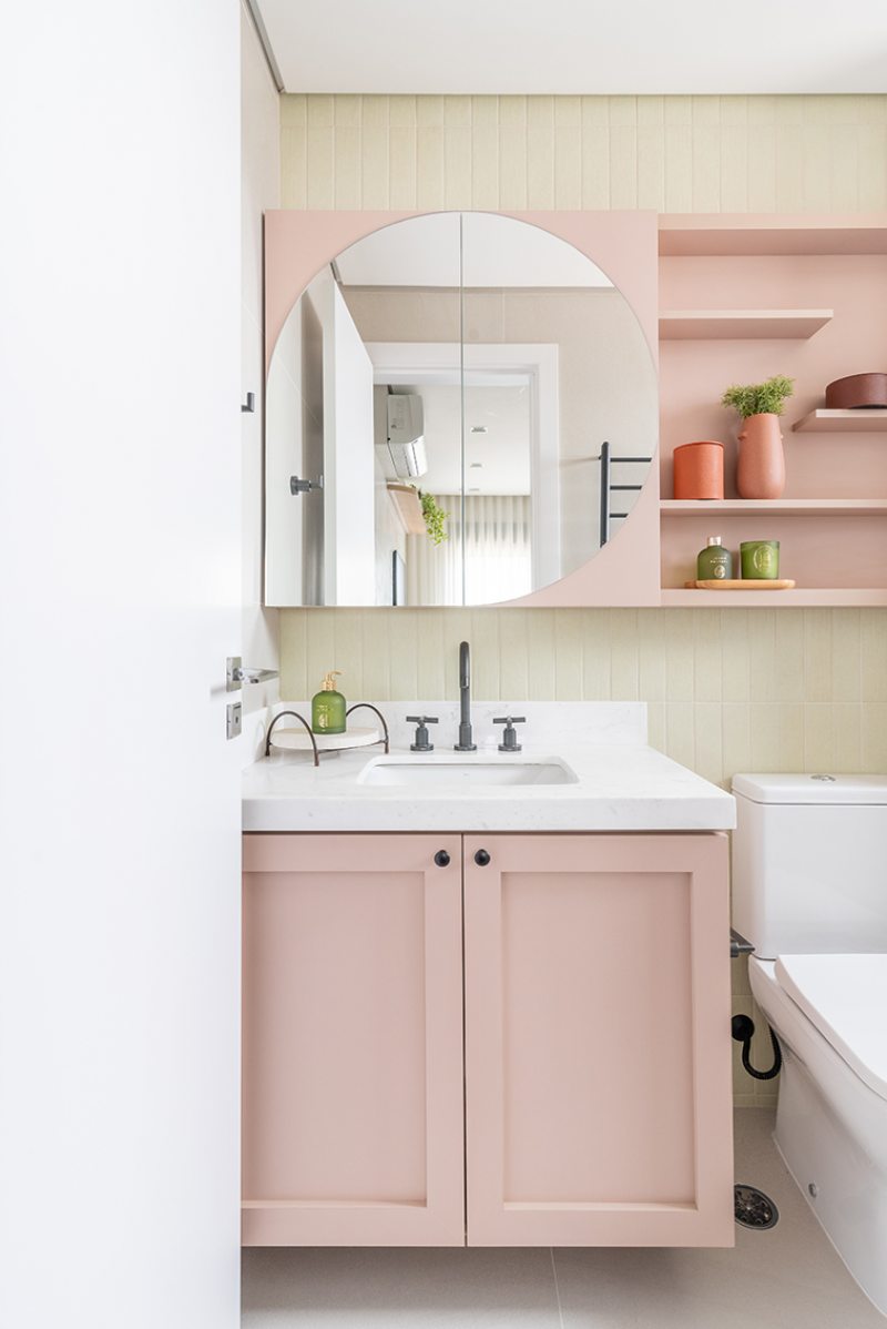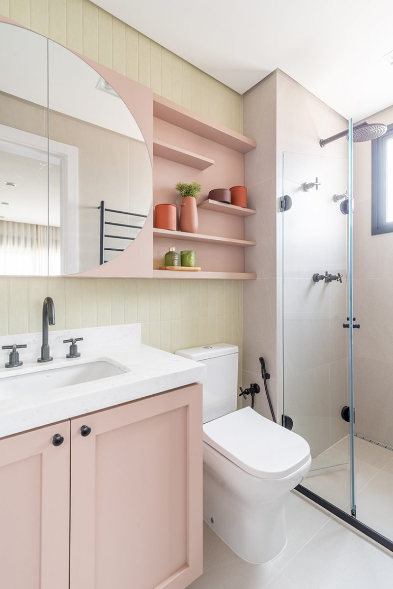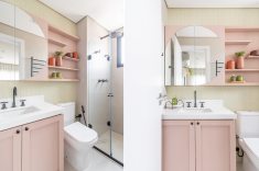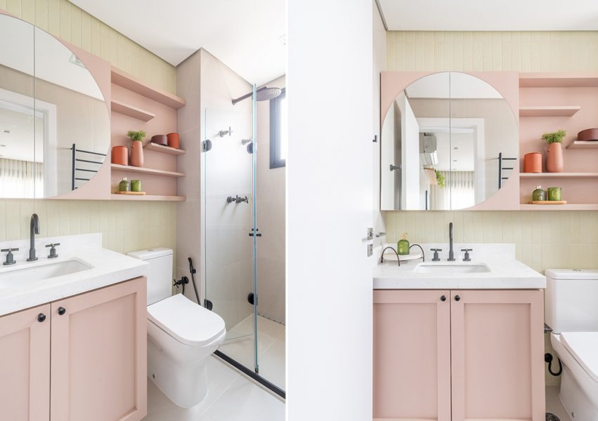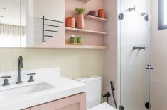 O rosa claro ocupa todo o projeto de marcenaria desse banheiro, englobando os armários e as prateleiras. Aqui a profissional optou pela especificação dos metais pretos que estão em alta: torneira com misturadores, chuveiro, registros e outros acessórios utilizados. Para Mari, é importante entender e definir as tonalidades de rosa que sejam condizentes com o estilo e as aspirações do projeto. “Os tons mais claros evocam a atmosfera de romantismo, enquanto os mais fechados chamam mais atenção e sugerem modernidade”, sintetiza.