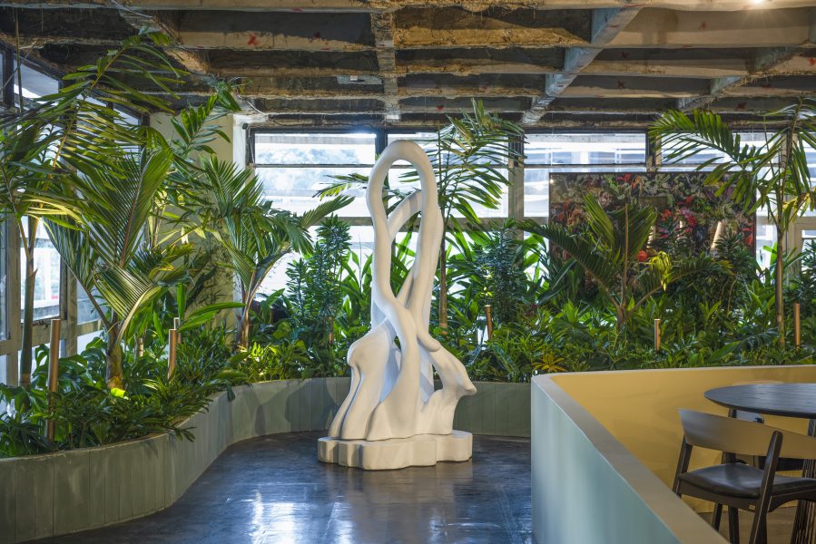 No “Restaurante Tropical” (foto acima) - projeto de Gustavo Paschoalim e Frederico Cançado - o ambiente foi desenvolvido a partir do limite traçado para o jardim. A junção do estilo arquitetônico de David Libeskind com curvas orgânicas inspiradas em Burle marx inspirou o projeto. Na parte externa, o público se depara com a Bailarina da Natureza, por Bia Doria: a escultura constrói o imaginário como uma coreografa intuitiva da natureza. O espaço ainda conta com obras dos renomados artistas como Manoel Vitor, Dani Tranchesi e Túnica Barbosa.