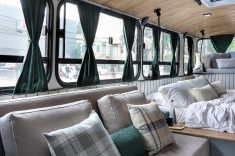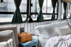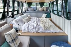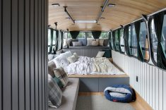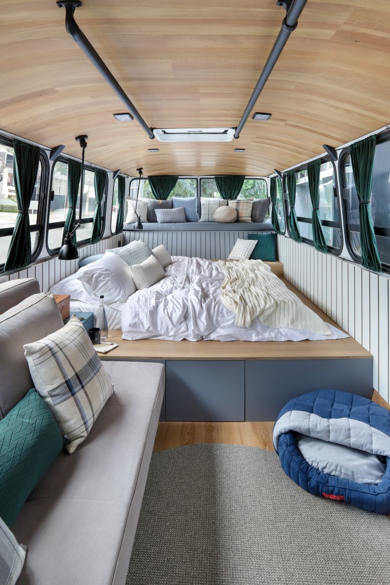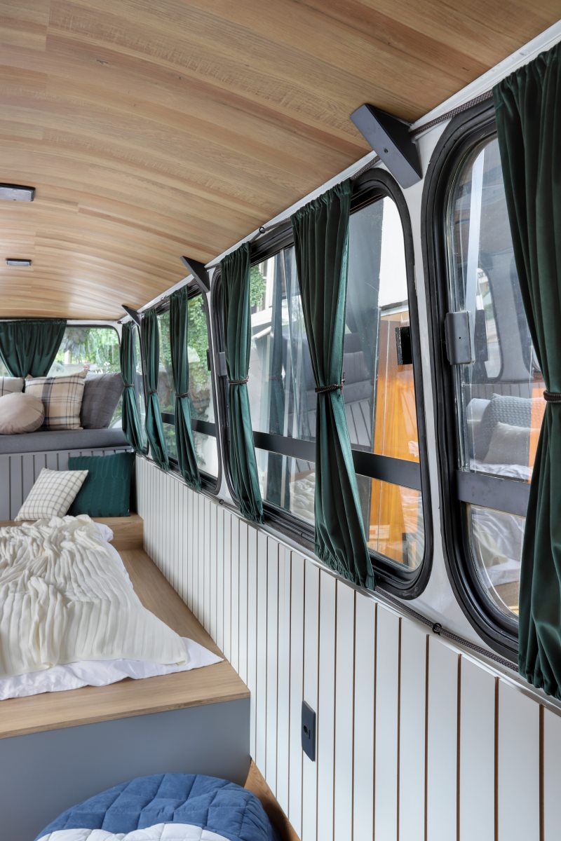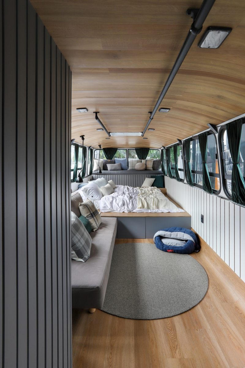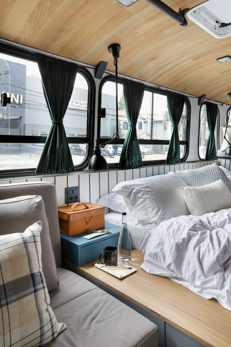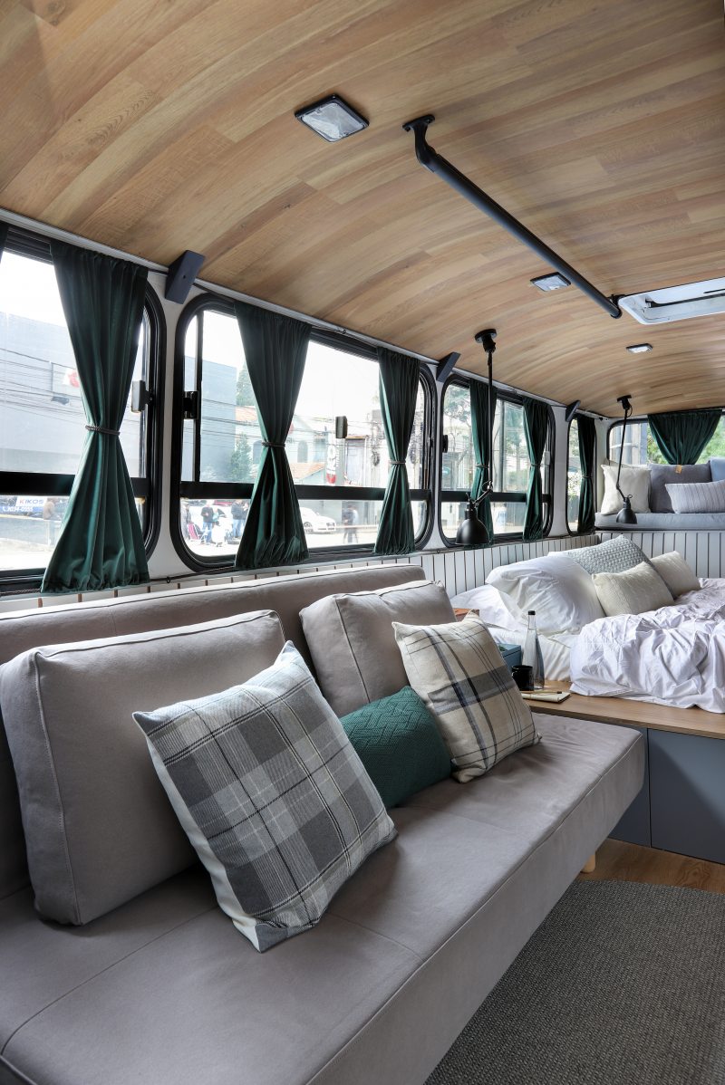 Com 27 m², o Outro Chão oferece estrutura para hospedar até 2 adultos e 2 crianças, contendo uma cama principal espaçosa e um sofá-cama desenhado por Fernando Jaeger. "A montagem da cama foi um episódio à parte. Sabe aquelas camas com jeito de tatame? Eu e a Pati já que queríamos deitar", brinca Mariana Orsi. Para a caracterização do ônibus, as novas cortinas reproduzem o visual das cortininhas de ônibus de antigamente, amarradas com couro trançado.