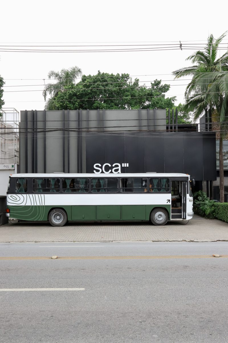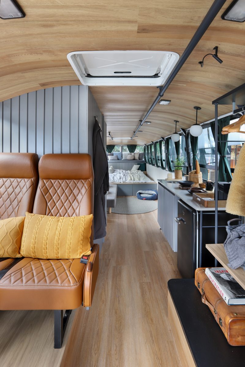 No processo de restauração o ônibus ganhou uma série de itens de conforto, sem perder a originalidade capaz de conectá-lo automaticamente à memória afetiva do público-alvo (adultos de 35 a 45 anos). Por fora, o veículo foi mantido em suas características orignais, ganhando uma pintura com as cores da marca e um tratamento antiferrugem. Já por dentro, a reforma completa incluiu manta termoacústica na lataria e um piso com novas placas metálicas e piso vinílicoTarkett com aquecimento. O forro, com revestimento vinílico desenhado pela Doma Arquitetura, recebeu pendentes e spots LabLuz. "Nesse projeto, juntamos dois mundos, o da oficina mecânica, com restauro de lataria, ferrugem, reforma de janelas, etc., e o da construção civil", conta Patrícia, da Doma Arquitetura.