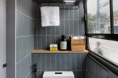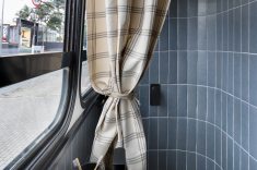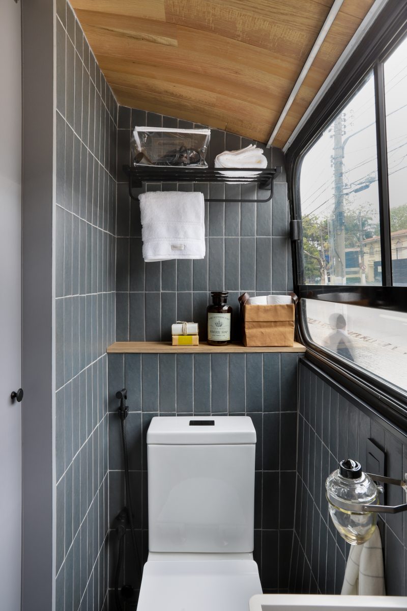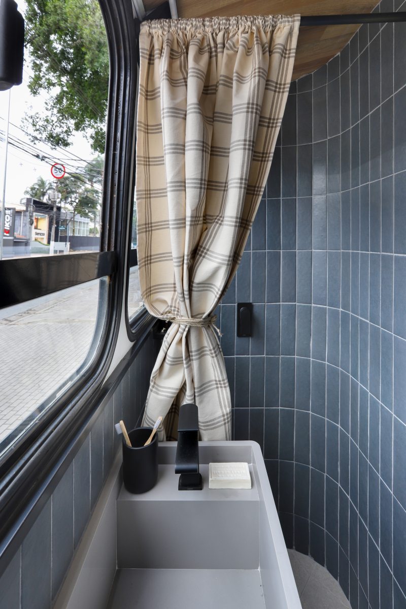 Todo o restante do ônibus recebeu marcenaria da SCA Jardim Europa, com detalhamento de projeto feito em parceria com a Doma Arquitetura e pensado especificamente para atender às necessidades do espaço. Além de todo o revestimento lateral do ônibus, o banheiro também foi revestido com um painel ripado com porta camarão que mimetiza completamente o banheiro. "Um dos grandes desafios neste projeto foi desenhar um banheiro com medidas reduzidas e confortáveis dentro do ônibus", conta Patrícia, da Doma Arquitetura. Para o revestimento do banheiro, Patrícia escolheu a linha Horizontes, da Portobello. Confira todas as imagens em nossa galeria!