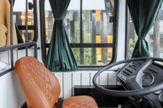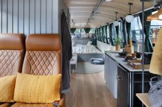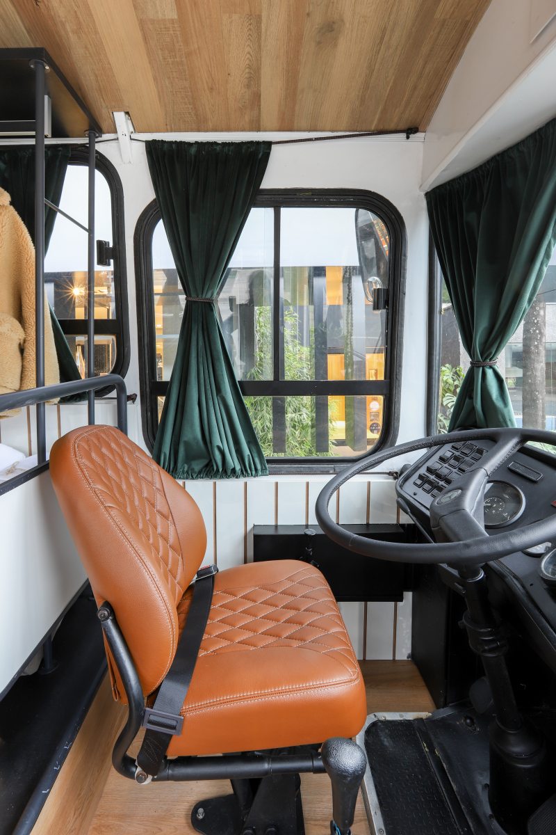 Para restaurar todos os itens possíveis, o volante foi refeito com couro natural e costura especial. As poltronas também passaram por restaurações e ganharam novos estofados. "Essas poltronas trazem a memória do uso: quando eram de um ônibus, serviam para sentar e deslumbrar a vista. Agora, continuam com a mesma ideia, só que com a mudança de outro chão, estimulando as pessoas a se desconectarem quando estão dentro do ônibus", explica a arquiteta Patrícia.