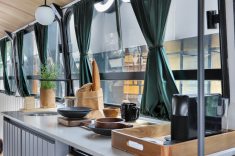 Os hóspedes poderão escolher se querem cozinhar no espaço ou serem atendidos pela Pousada Pinho Bravo, que servirá o café da manhã no restaurante ou no próprio ônibus. A cozinha reúne frigobar e cooktop de indução que pode, inclusive, ser usado na área externa do chalé.