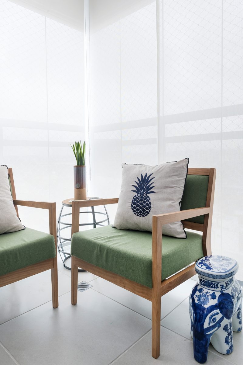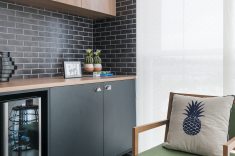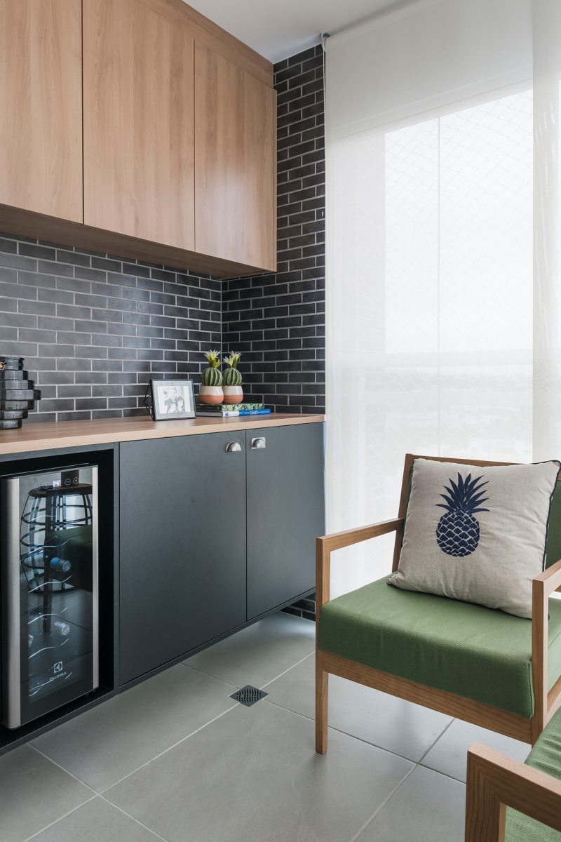 O terraço reservado não é integrado ao estar, mantendo a porta de vidro como divisão dos espaços. Ao invés de churrasqueira – item tão solicitado nos apartamentos, a varanda possui uma adega para guardar os vinhos para relaxar no final do dia, atendendo assim ao gosto do morador, que apresentou sua paixão pelos rótulos. A marcenaria em um tom de madeira escuro contrasta com as poltronas mais claras.