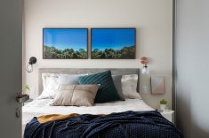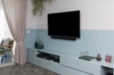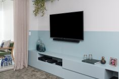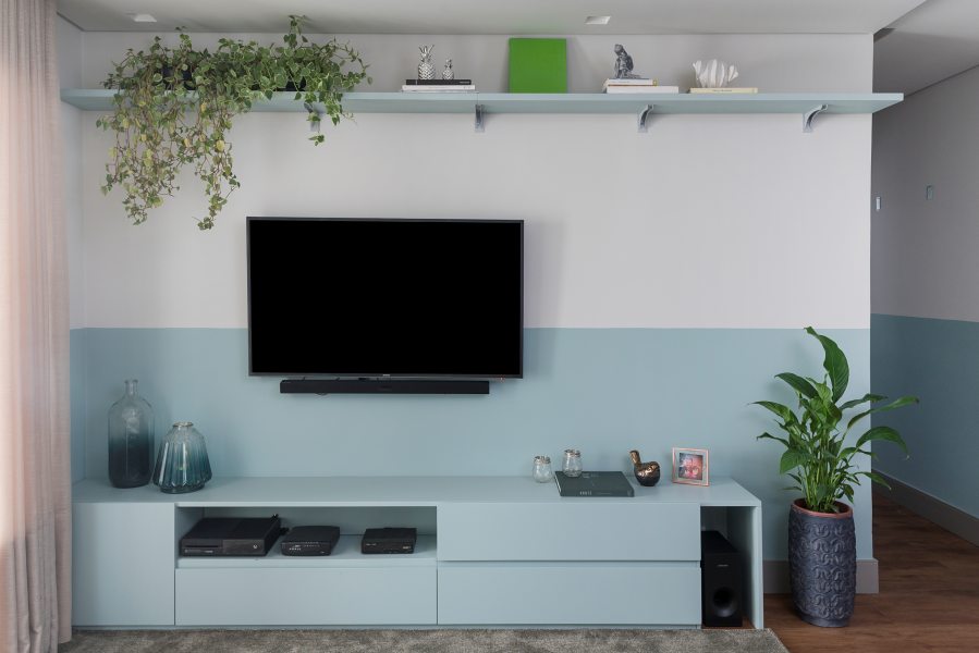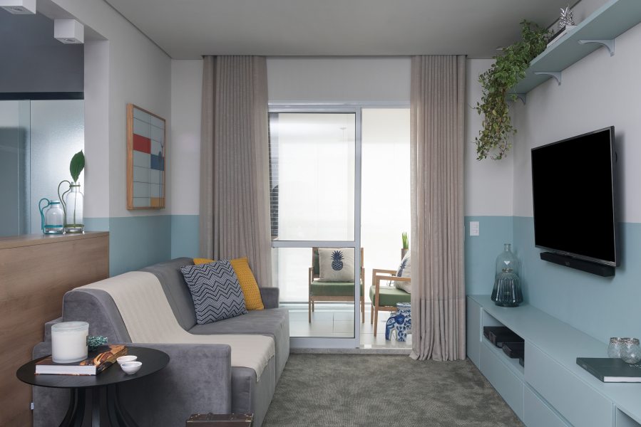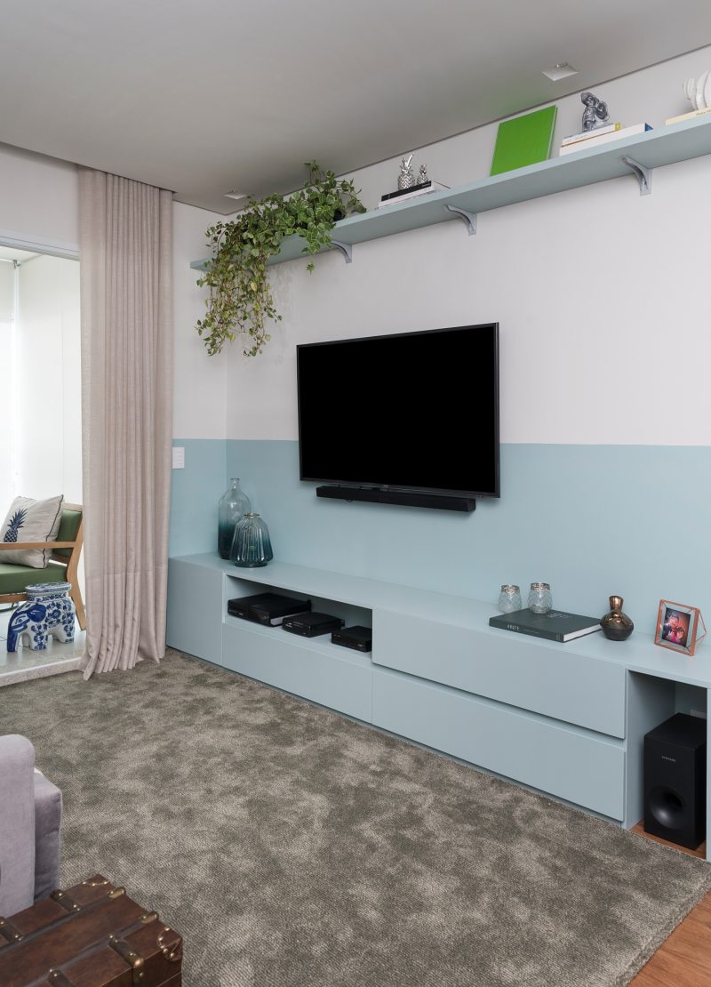 O estar segue o mesmo conceito. O sofá, fornecido pelo cliente, o tapete, da loja Santa Monica e as almofadas da Alamanda acompanham a mesma paleta de cores. O rack foi pintado de azul, como o tom da meia parede, para complementar o charme da sala. A paleta de cores também marcou presença no corredor entre os quartos.