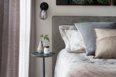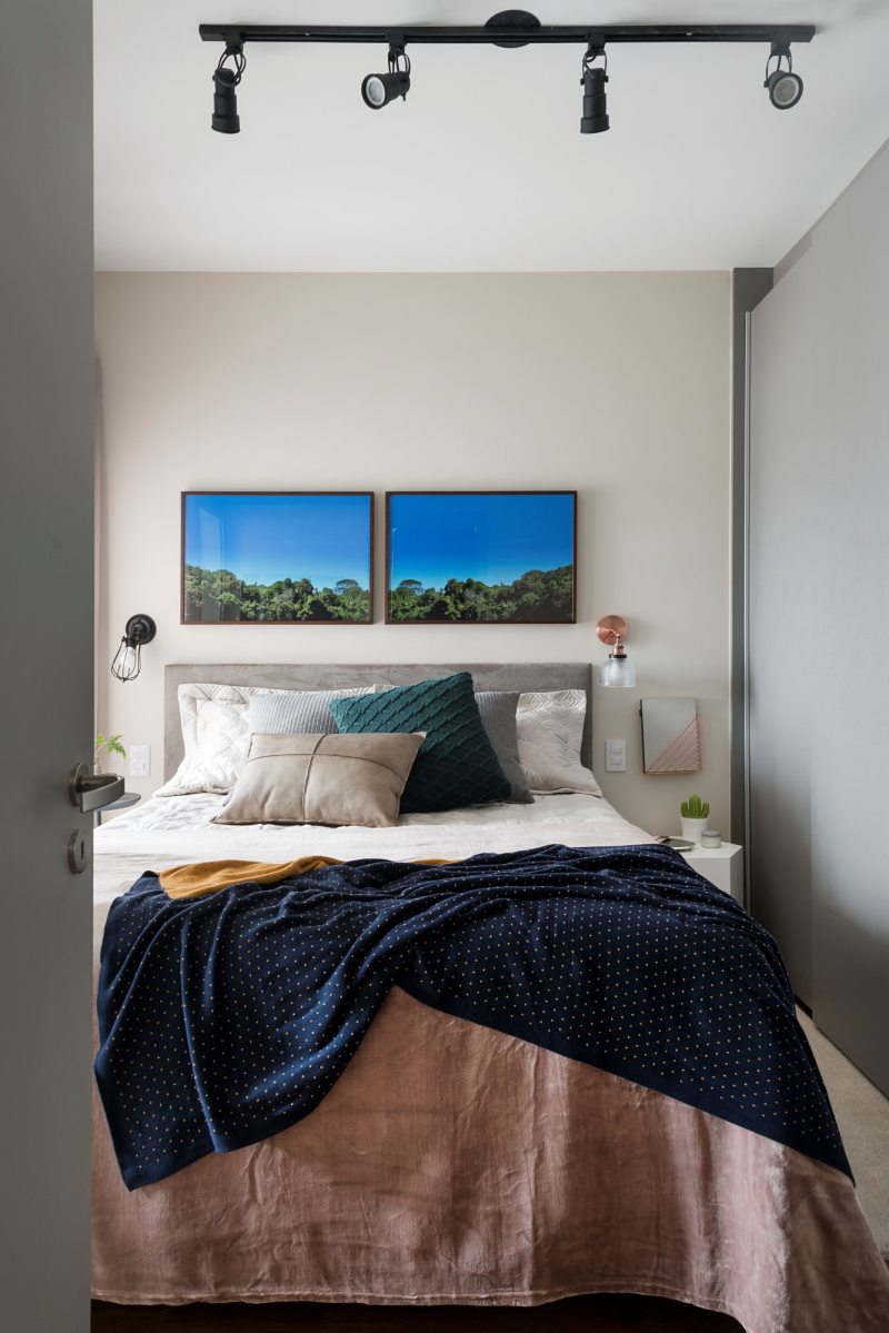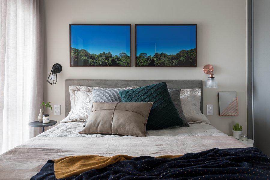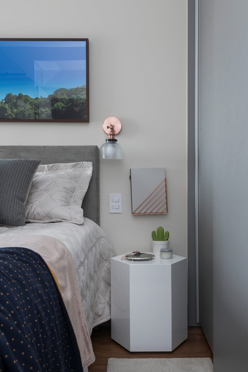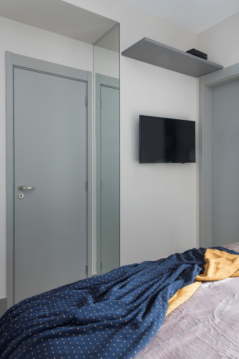 A suíte recebeu uma cama Queen Size, armário de roupas da Todeschini com portas de correr e com espelho posicionado na parte de trás. Além disso, a prateleira com os equipamentos para a TV foi posicionada na altura do batente da porta do banheiro.