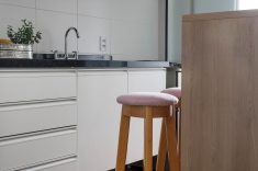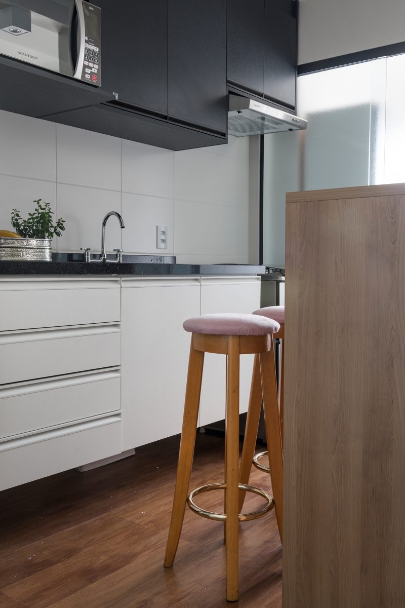 Para a cozinha, as profissionais decidiram pela retirada da parede que dividia a cozinha e a sala na planta original para oferecer mais amplitude. Os armários superiores receberam tons diferentes, e o balcão em tom de madeira confere praticidade na hora das refeições rápidas.