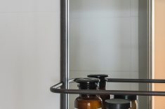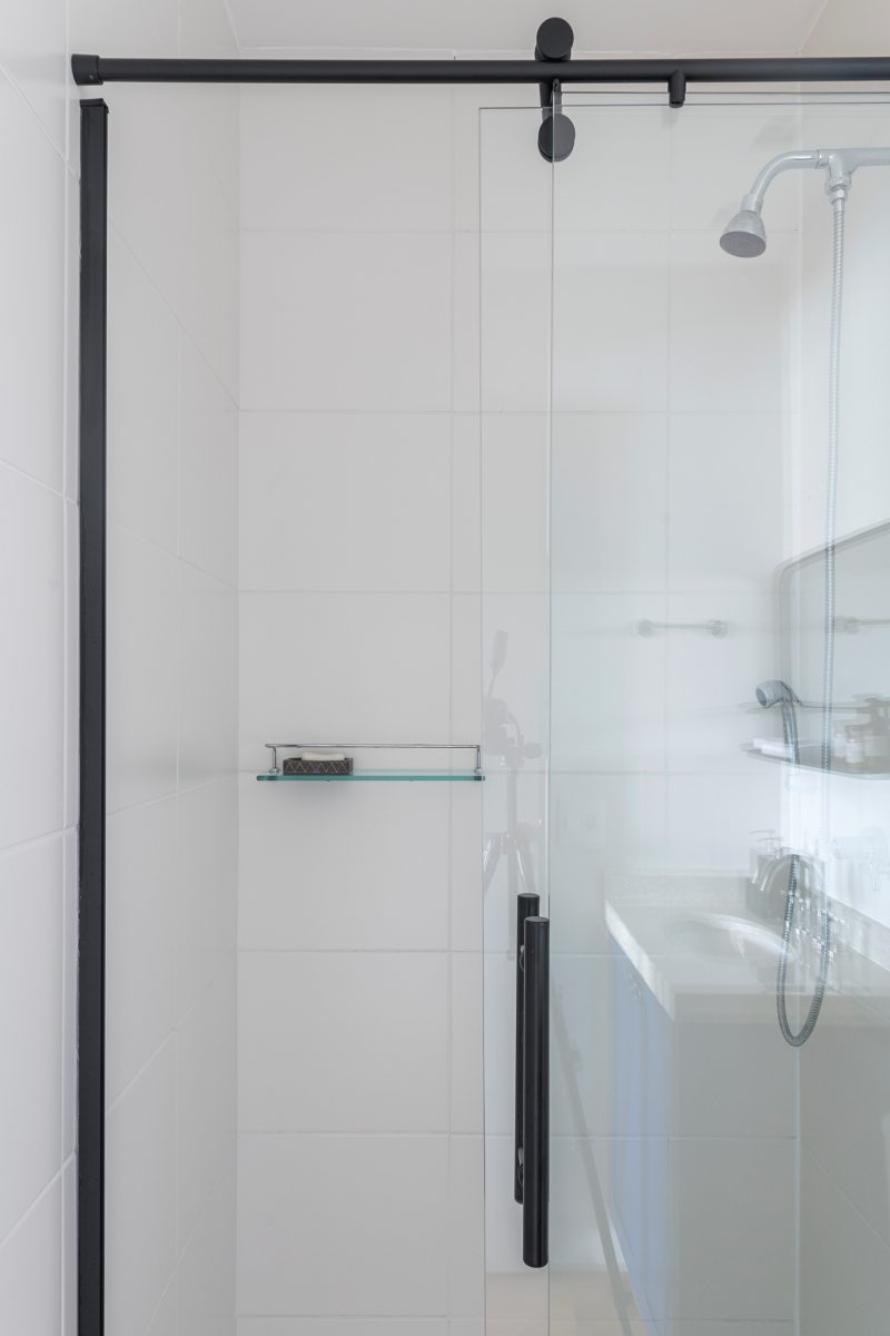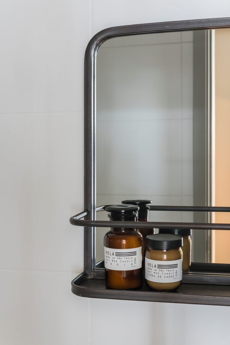 No banheiro, o ponto de cor está no armário da bancada, funcionando como contraste no ambiente branco. O espelho em estilo industrial possui prateleiras para os produtos de higiene.