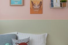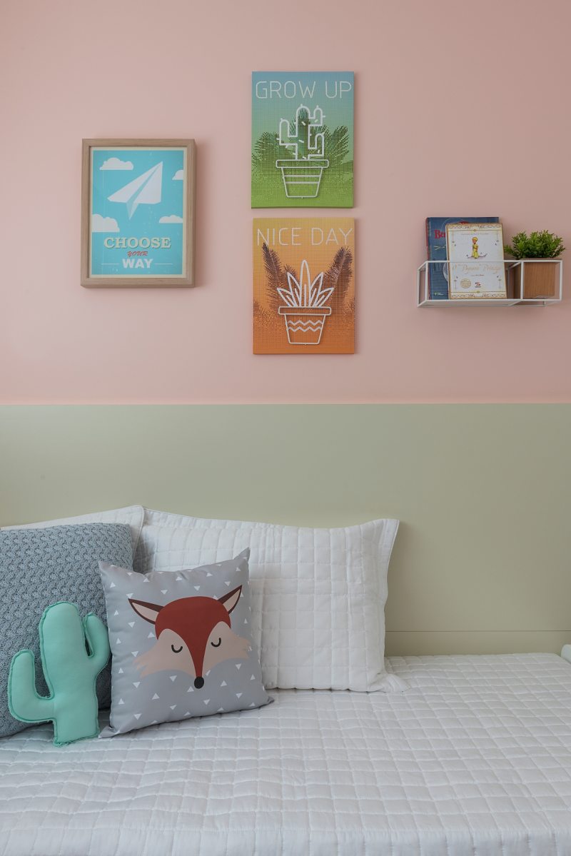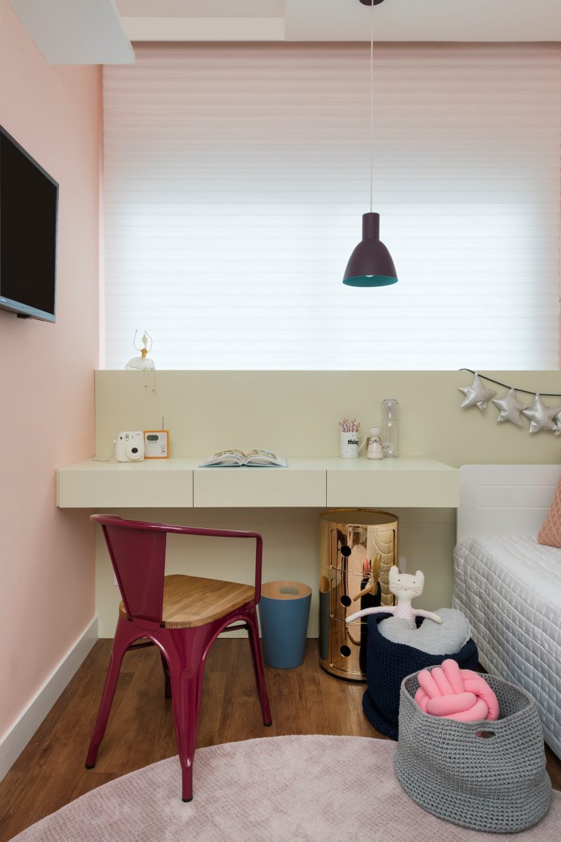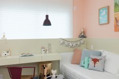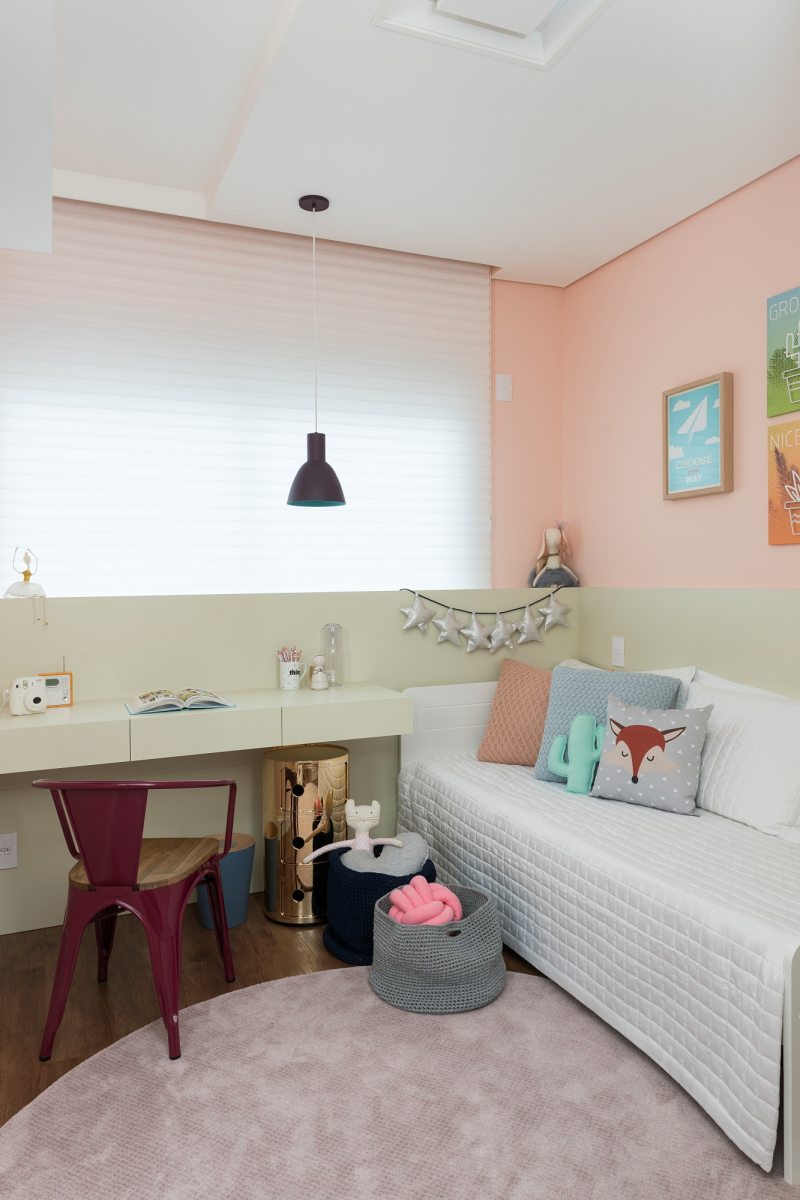 O quarto da menina é marcado por cores neutras e móveis práticos, sem necessidade de grandes mudanças. O destaque vai para a combinação do salmão das paredes com o verde claro dos móveis.