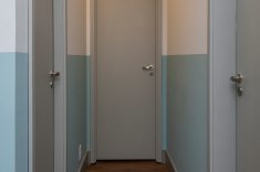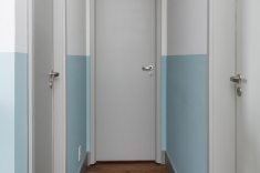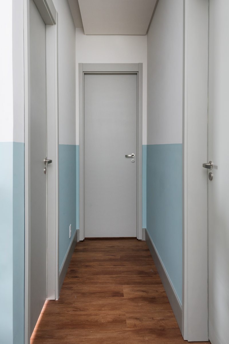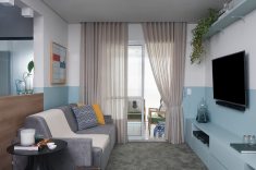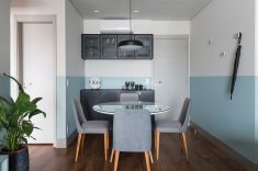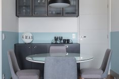 As arquitetas traduziram os gostos do pai empresário e da filha, de apenas quatro anos, em uma atmosfera aconchegante com mescla de cores. A atmosfera descontraída pode ser percebida desde a entrada. De cara, a escolha de pintar meia parede com um tom de azul claro, deixando o restante no tom cinza – mesma cor do teto – chama atenção dos visitantes. A mesa de jantar redonda com tampo de vidro facilita a circulação. As quatro cadeiras de madeira e revestidas com linho cinza complementam o ambiente da sala. A marcenaria, presente no aparador e nos armários escuros, foi produzida pela Todeschini.