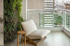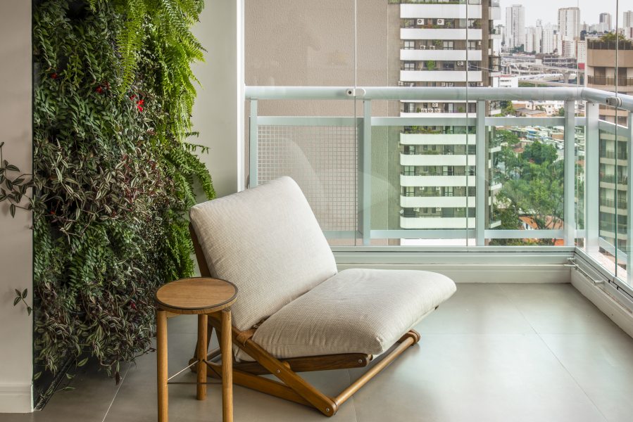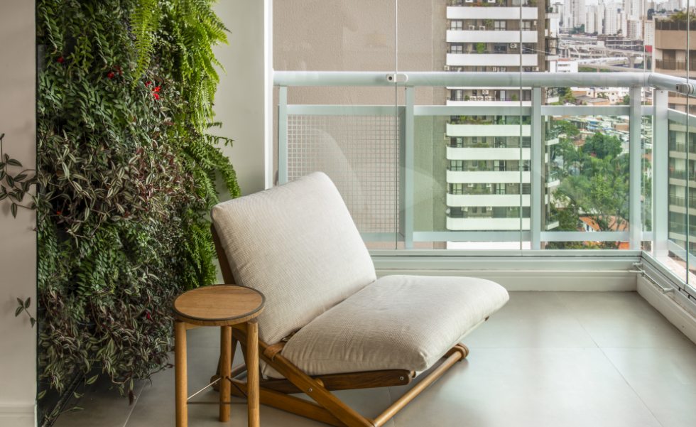 Neste projeto a varanda se transformou em um canto de leitura. Para quebrar a frieza dos prédios que rodeiam o apartamento a designer de interiores Raquel Braga e arquiteta Mariane Graciano apostaram no jardim vertical na parede principal e em tons claros e amadeirados no mobiliário. O piso de porcelanato imita cimento queimado e segue em perfeita harmonia com o décor. Para garantir a iluminação natural, as profissionais usaram barreiras de vidro.
