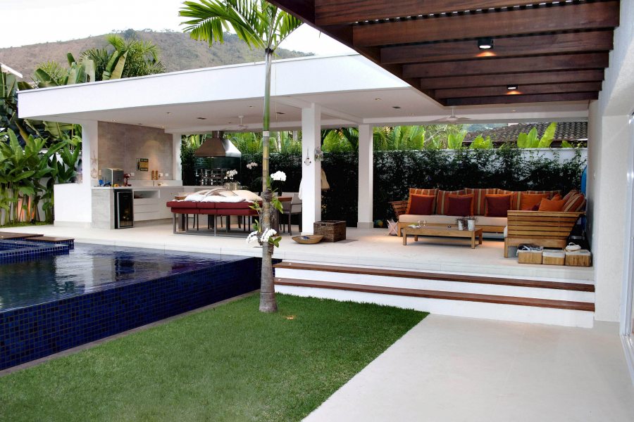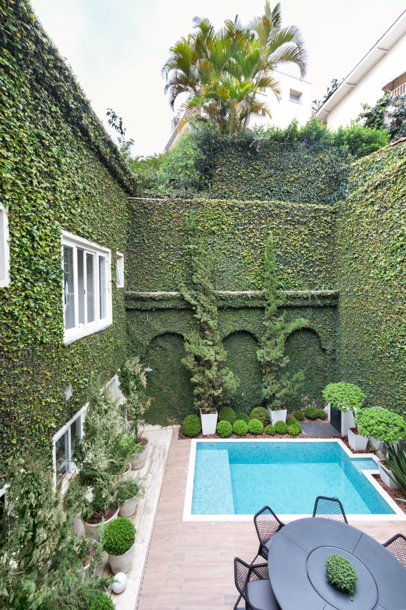 Buchinho, trepadeira, kaizuca, pé de limão e lavanda: essas são algumas das espécies de plantas usadas pela arquiteta Barbara Salles para criar um ambiente intimista e aconchegante para descansar e receber. Ponto focal do espaço, as paredes trazem a tendência Urban Jungle para dentro de casa. No meio do espaço, uma pequena piscina com deck de madeira para reforçar o aconchego do lar.
