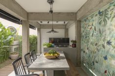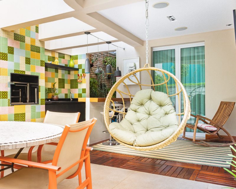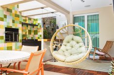 Localizada na Zona Sul de São Paulo, a área externa desta casa tem projeto retrofit e paisagismo assinados por Gabriela Mendes. O espaço de 85m², o espaço está mais verde (a pedido dos clientes, que eram de BH, e sentiam falta da natureza). Com uma linguagem limpa, a área da churrasqueira mescla peças em tons quentes e frios e acabamentos naturais e nobres, mas que transitam em perfeita sintonia. O aconchego também marca presença e pode ser conferido no balanço suspenso, que propicia um cantinho perfeito para as pausas diárias.