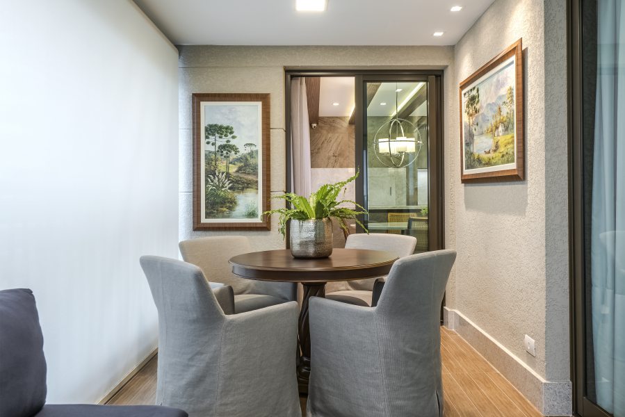 A varanda aconchegante ganhou uma mesa especial para receber as amigas da cliente, que adora passar tardes jogando baralho.