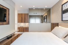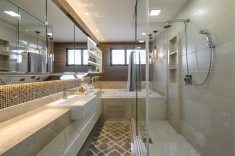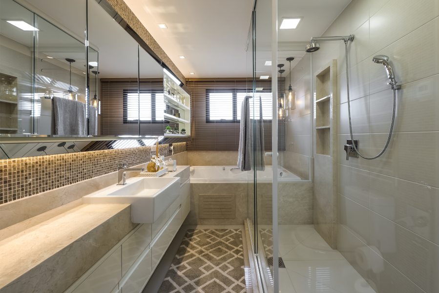 Confortáveis, a suíte máster e o banheiro ganharam elementos discretos que permitem a mobilidade e segurança dos moradores.