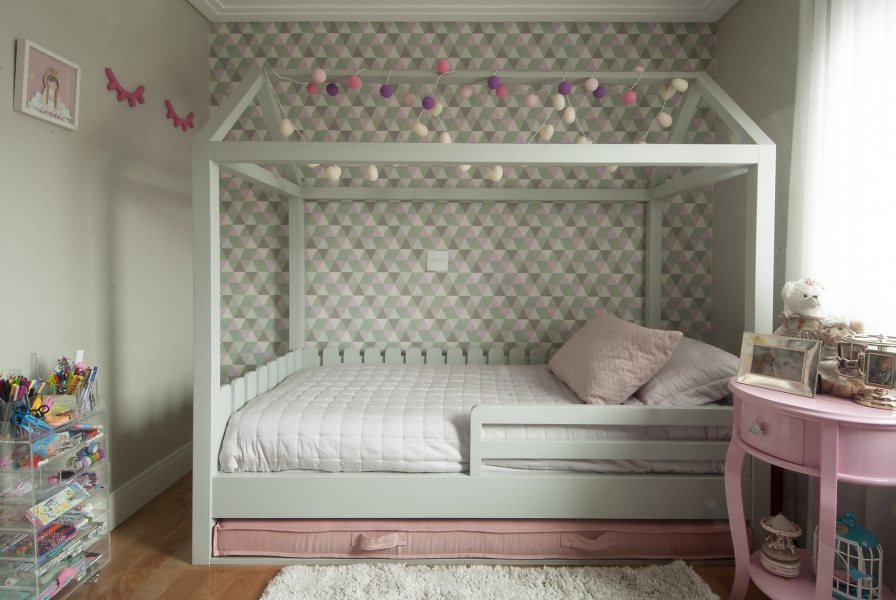 "Eles também são ótima aposta para quartos infantis, pois são fáceis de substituir, caso desejado", dizem. Por isso, também foi a escolha da dupla para o quarto da menina (foto acima). O modelo traduz a paleta de cores de todo o dormitório e ainda cria um efeito levemente tridimensional, com as formas geométricas.