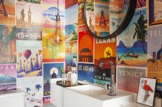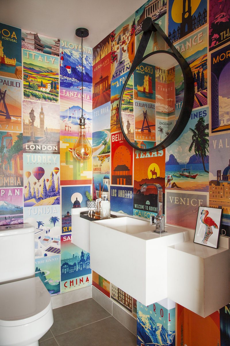 Para o lavabo do apartamento dos clientes, que adoram viajar, as profissionais optaram por uma proposta super colorida. A técnica de lambe-lambe, utilizada no projeto, aplicou às paredes retratos dos países que os clientes já visitaram ou planejam conhecer. "A composição ficou única e cheia de personalidade, sendo valorizada pela iluminação".