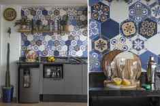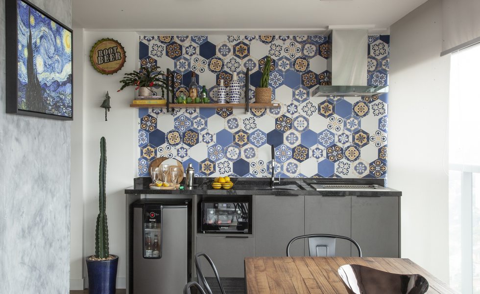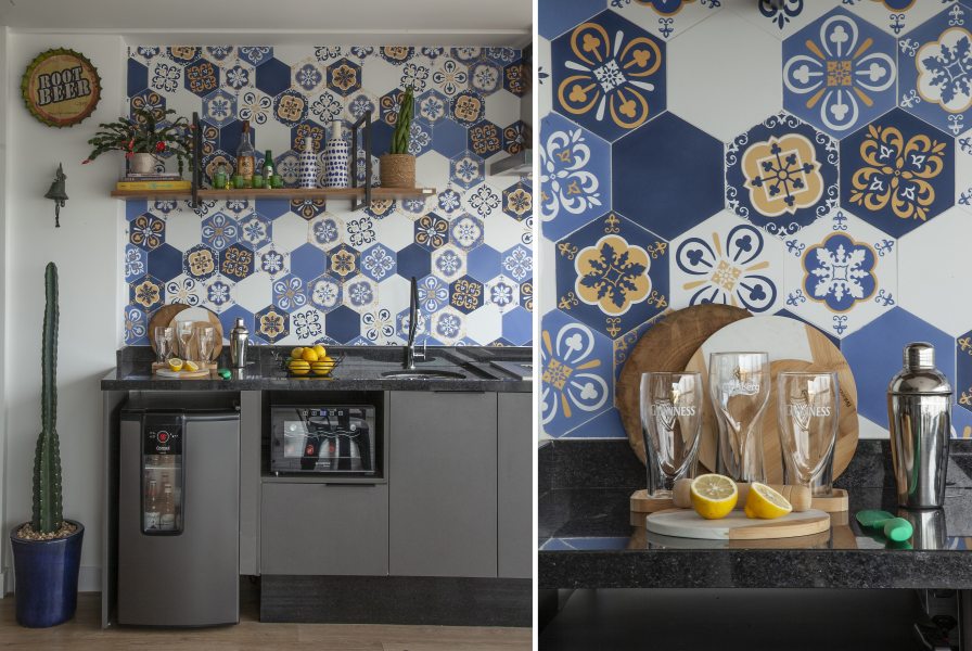 Trazer cor e leveza para a varanda gourmet foi um dos desejos de Bianca Tedesco e Viviane Sakumoto para o projeto desse apartamento, em São Paulo. Além de harmonizar com a paleta de cores de todo o estar, os ladrilhos hidráulicos (Baepi) foram a escolha para criar um cantinho de destaque, conferindo uma estética retrô para o ambiente. Eles atraem o olhar para a área da bancada, que foi toda equipada com churrasqueira, cervejeira e adega. "Para harmonizar, as outras paredes são neutras, com tons de branco e cimento queimado", apontam as profissionais.