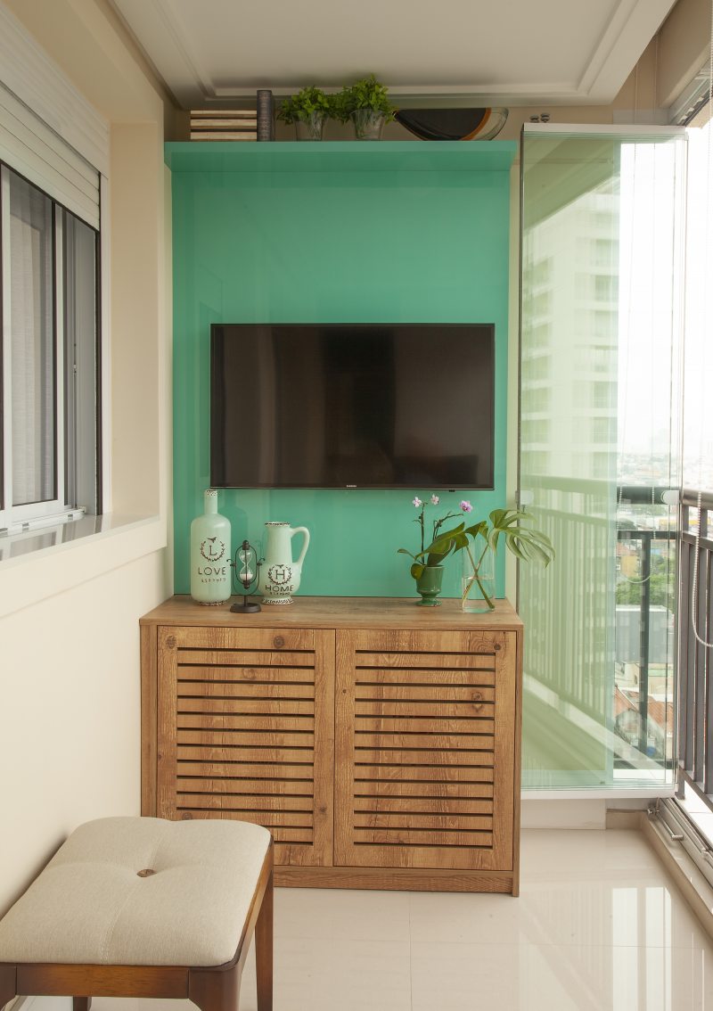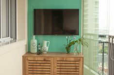 Por fim, impossível falar em paredes sem pensar nas cores. Para conferir destaque ao cantinho da televisão, nessa varanda gourmet, as profissionais da Tesak Arquitetura optaram por um tom de verde acqua que complementa perfeitamente com o móvel de madeira. "O verde é uma escolha que aproxima a natureza dos interiores, conferindo sensação de bem-estar e aconchego", explicam.