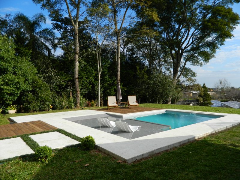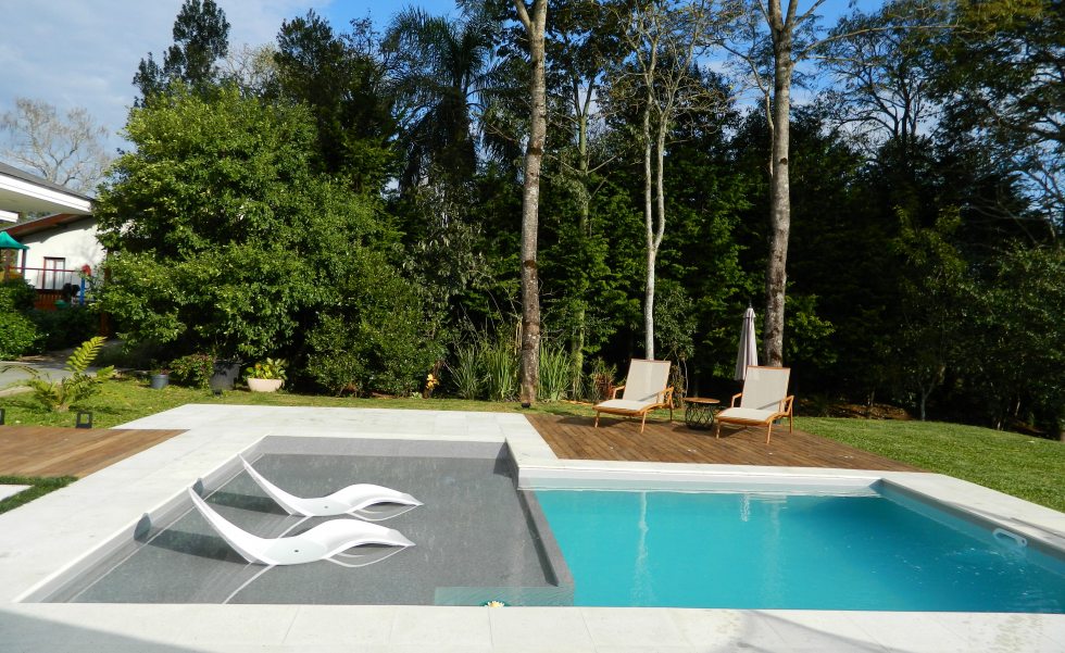 Além da beleza natural dos jardins o projeto também contou com inovações tecnológicas. Os revestimentos das bordas e pisos são antiderrapantes e atérmicos, garantindo a segurança da família e preservando o seu conforto independentemente da incidência de luz solar ou condição climática. A parte rasa recebeu o revestimento Desjoyaux Prestige, que remete ao mar da Grécia, enquanto a parte mais funda recebeu o revestimento Gris Clair, diversidade que propiciou um belo efeito contrastante nas tonalidades da água e deixou o resultado ainda mais orgânico. Um refúgio tranquilo, que atendeu às necessidades dos clientes e criou uma paisagem inspiradora integrada à natureza: um convite para relaxar ao ar livre.
