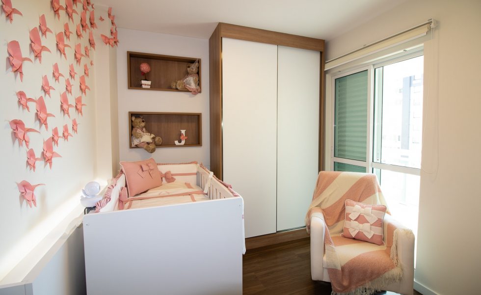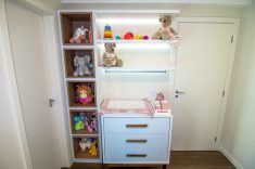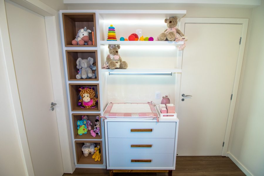 Mesmo sendo um espaço compacto, o berço e o trocador são essenciais, sempre pensando na praticidade. Segundo a arquiteta Ana Johns, do escritório Ana Johns Arquitetura, a iluminação deve ser adequada, com luz focada para o trocador e outra indireta para o ambiente. Os materiais devem ser facilmente laváveis e que não acumulam pó, como MDF ou fórmica, além de tecidos antialérgicos. A profissional também comenta a respeito das cores utilizadas no quarto, pensando além dos tradicionais azul e rosa. “Cores como o cinza, bege, fendi e nude são boas para fazer composições com o azul e o rosa. Pensando a longo prazo, em um ambiente mais duradouro, é interessante utilizar cores neutras e deixar as cores mais fortes para os detalhes”, diz a arquiteta.