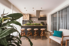 Acima: na varanda gourmet projetada pela dupla do Meet Arquitetura, a bancada contou com uma estrutura específica para o prazer de ter uma hortinha em casa (e à mão do morador-cozinheiro). Outras espécies de plantas contribuem para decorar e trazer os benefícios do contato com a natureza. | Foto: Henrique Ribeiro
