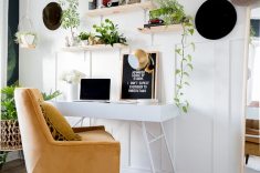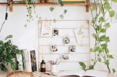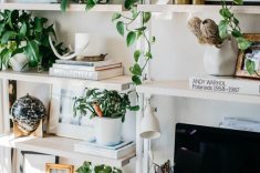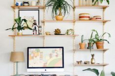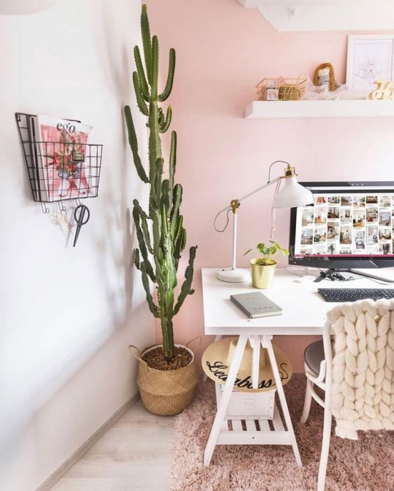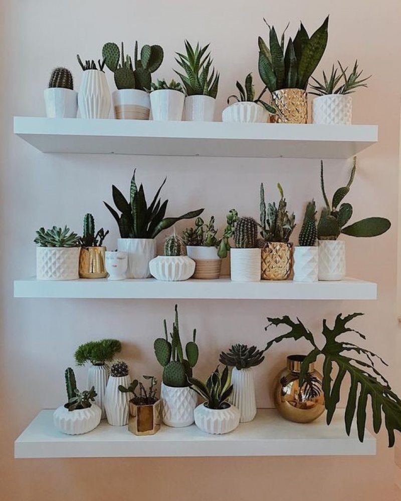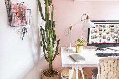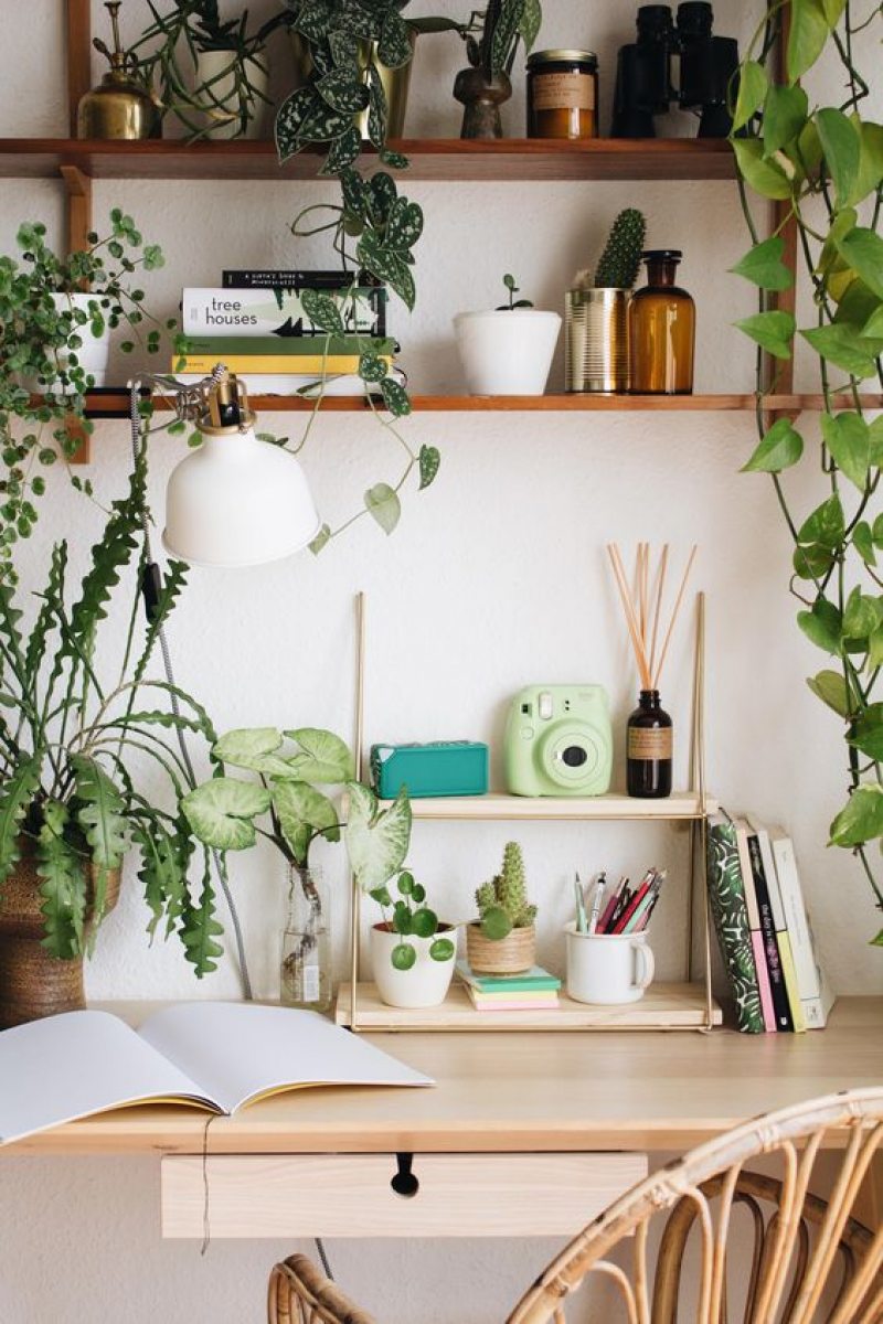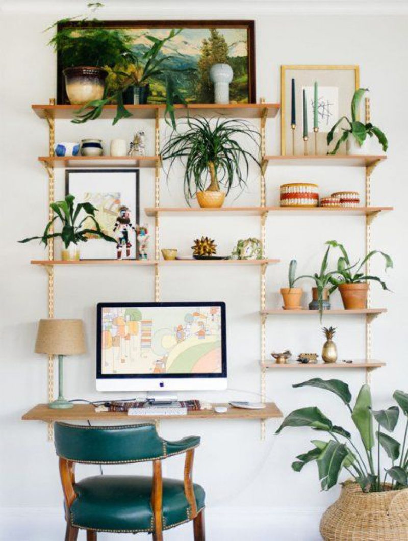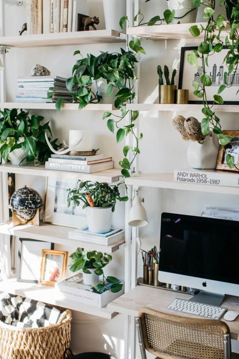 Existem estudos que dizem que os cactos, quando colocados próximos ao computador, podem absorver ondas eletromagnéticas que poderiam ser maléficas às pessoas. Faça um teste, é possível que seu cacto comece a criar pequenos braços e que você se sinta melhor no espaço ao trabalhar. Além desse benefício, o cacto é uma planta de fácil cuidado e manutenção. Para inspirar, prateleiras cheias de pequenos cactos ficam um charme.