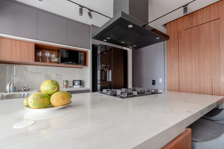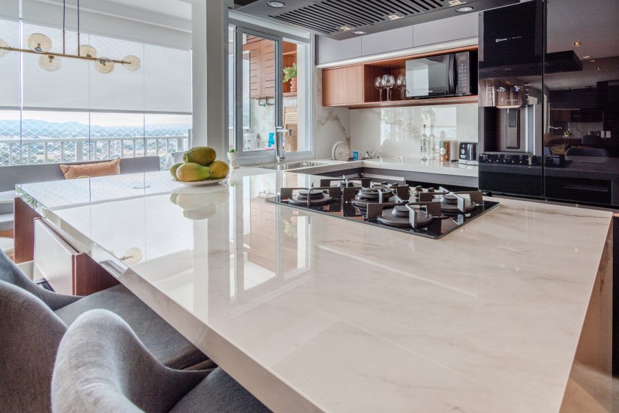 Nessa cozinha projetada pela arquiteta Ester Abraão, a área da bancada da cozinha, assim como o espaço para refeições rápidas e a ilha com cooktop a gás, foi revestida com o clássico porcelanato Mármore Paraná, da Roca Cerámica. A linha está disponível nos superformatos 120 cm x 120 cm, 120 cm x 250 cm e 160 cm x 160 cm e nos acabamentos Micro Crystal e Soft Touch. Fotos: Larissa Gregio / Divulgação F3 Cortes