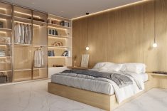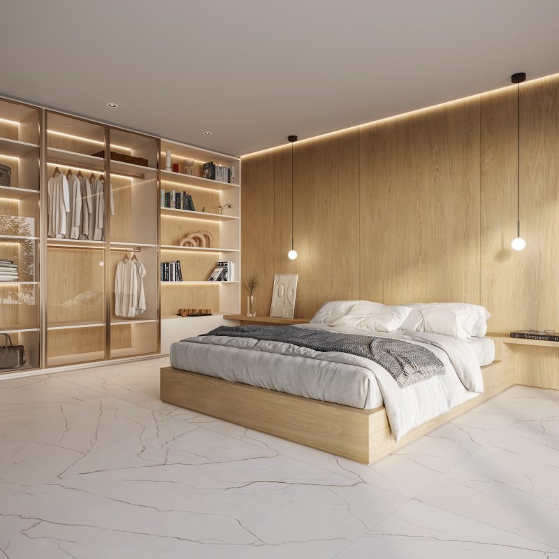 Cama e painel de fundo em porcelanato Legno Rovere 120 cm x 250 cm. Foto: Divulgação Roca.