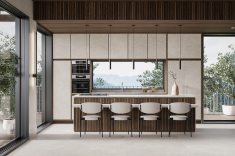 Na cozinha, o porcelanato Concrete, da Roca Cerámica reveste os armários com o mesmo modelo escolhido para a bancada e o piso. O modelo está disponível nos superformatos 120 cm x 120 cm, 120 cm x 250 cm e 160 cm x 160 cm e em três diferentes cores- off white, gray e greige. Foto: Divulgação