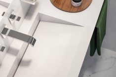 Nos banheiros e lavabos, bancadas e cubas esculpidas podem receber toda a beleza do porcelanato. Na imagem, o modelo Koronis, da Roca Cerámica – disponível em seis diferentes formatos, entre eles os novos 160 cm x 160 cm e 160 cm x 320 cm, nos acabamentos mate e micro crystal. Foto: Divulgação
