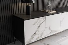 O modelo Calacata Light (disponível em seis tamanhos – como o superformatos 120 cm x 120 cm e 120 cm x 250 cm – além de três diferentes acabamentos) reveste o piso e as portas do buffet. Foto: Divulgação Roca.