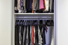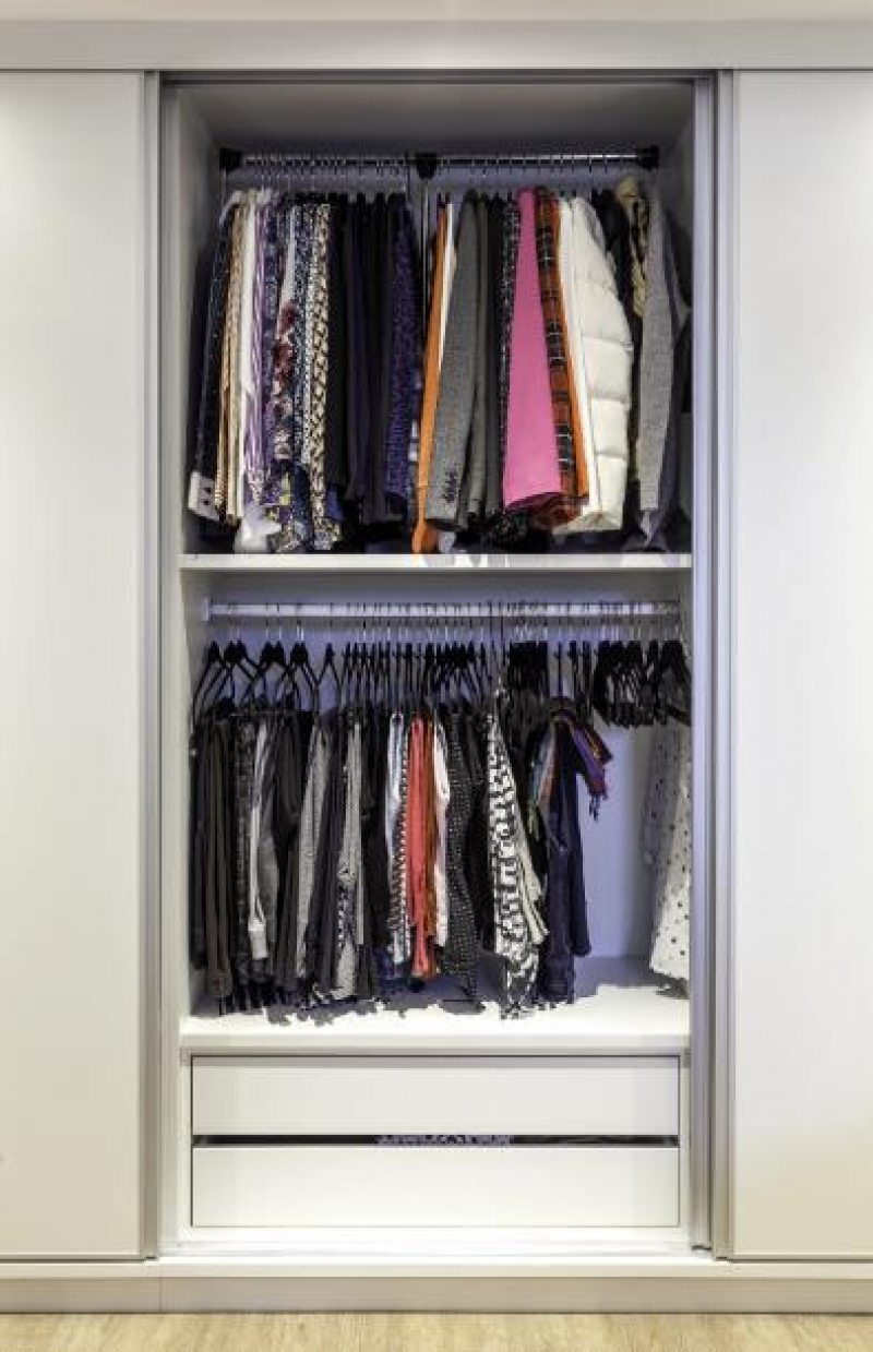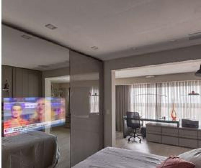 Nesta suíte, os armários trazem portas de correr espelhadas. A ideia da profissional foi não ocupar espaço na circulação do ambiente e trazer amplitude visual com o reflexo da peça. Para otimizar, a TV foi instalada direto na porta espelhada do armário. No closet, com a ajuda de uma boa marcenaria, portas de correr ajudaram a adaptar o projeto de acordo com o desejo da cliente, deixando todas as roupas e acessórios setorizados e bem organizados.
