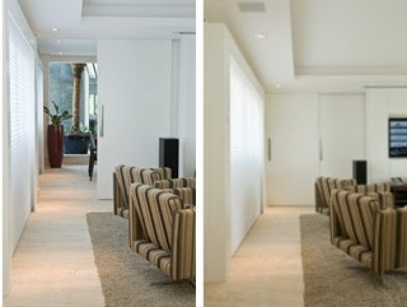 Apesar de não correr o risco de bater com o vento e não contar com dobradiças que podem fazer barulho, as portas de correr nem sempre oferecem um bom desempenho acústico. “Como nem sempre são mantidas completamente fechadas e possuem vãos entre peça e a parede, nem sempre é possível controlar a saída e a entrada de som entre os cômodos”, reforça Cristiane.