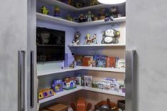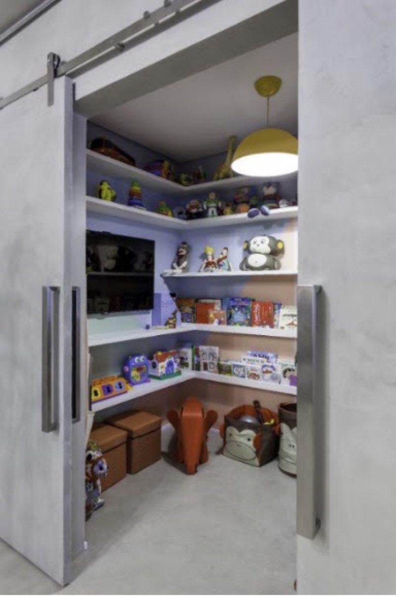 Quem tem crianças em casa sabe: é preciso ter um espaço para guardar os brinquedos! No apto integrado, a arquiteta posicionou a brinquedoteca voltada para o ambiente social, como uma forma dos pais observarem a movimentação dos pequenos. Dessa forma, a porta de correr com abertura para os dois lados figurou-se como essencial para preservar o cantinho dos filhos.