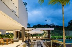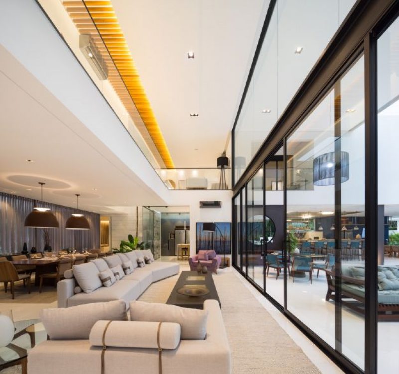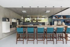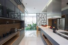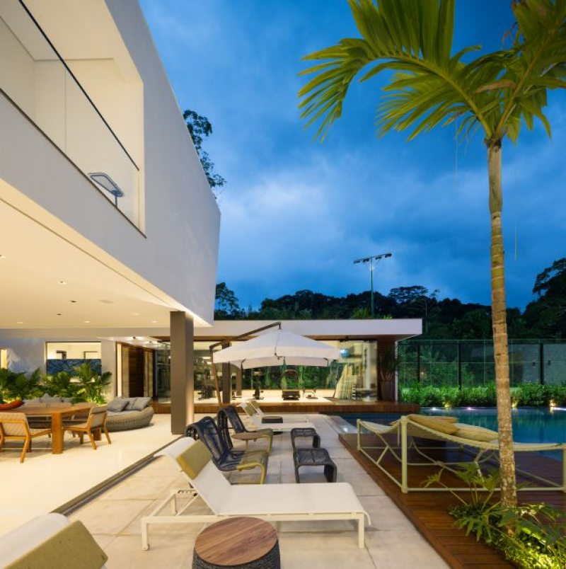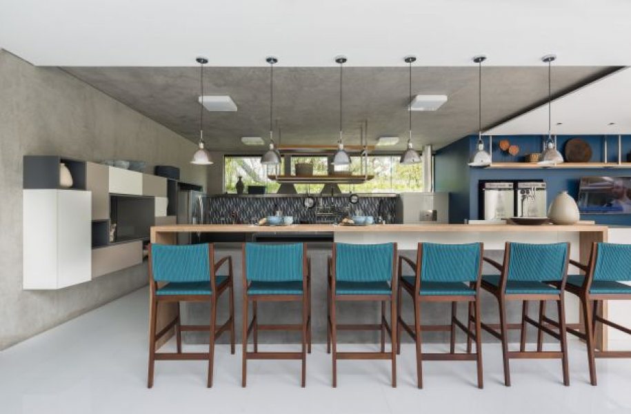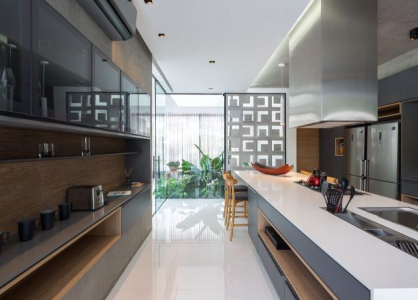 A cozinha integra espaços internos e externos e oferece apoio ao espaço gourmet. A iluminação natural foi priorizada em toda casa através de um jardim interno e aberturas zenitais. O paisagismo com vegetação nativa foi pensado para estar em harmonia com a Mata Atlântica e levá-la para dentro da casa - o projeto ganhou um jardim interno e uma cobertura verde nas áreas de ginástica. O entorno da edificação ganhou destaque com elementos naturais integrados à arquitetura e projetados para compor o espaço, traçando um enorme diferencial na forma como se experiencia o espaço.