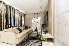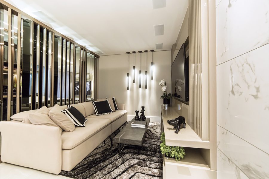 Ponto alto do projeto, o luminotécnico (Spot Lighting) é composto por pendentes que funcionam como esculturas, criando uma iluminação decorativa agradável. Barras contínuas de LED aparecem em detalhes no gesso e no mobiliário, criando soltura, enquanto arandelas retangulares impactam os visitantes na entrada do apartamento.