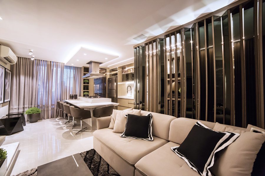 A fluidez e comunicabilidade dos ambientes foi um dos pontos principais abordados pela arquiteta Val Ruon ao revitalizar o apartamento de seu filho e de sua nora. Pensado com o coração de mãe, o projeto transformou completamente o imóvel de 75 m², antes divididos e com décor que abusava de cores fortes e detalhes rebuscados: “O apartamento tinha uma parede dividindo a sala da cozinha, o gesso tinha muita informação, a iluminação era cheia de excessos, o piso não tinha continuidade e não havia um hall de entrada definido.”, conta a profissional.