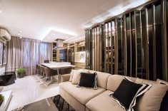 Após a reforma, que durou aproximadamente três meses, as paredes que dividiam a área social da casa foram retiradas, criando um único espaço integrado com cozinha gourmet e living com home theater. As bancadas da cozinha receberam porcelanato de grandes formatos, assim como pontos estratégicos das paredes, criando um visual homogêneo para a área social. O mobiliário de madeira ripada e painéis vazados com detalhes em espelho bronze, separam sutilmente os espaços sem impedir a integração entre eles.