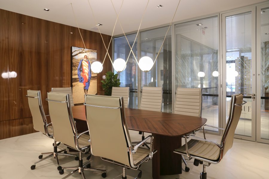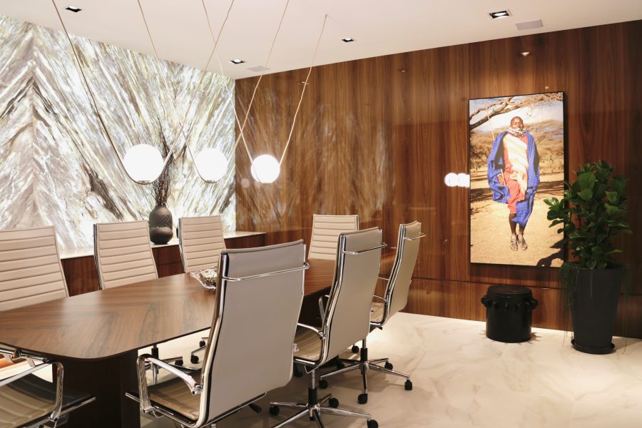 Na sala de reuniões do escritório, Mutao e Jacobs agregaram o projeto com um presente ao sócio-proprietário, de uma fotografia de um integrante de uma tribo africana, na Tanzânia. “É uma foto muito expressiva e que faz as pessoas pensarem. O homem é um africano que vive em condições miseráveis, mas quando chega um visitante na tribo, que é pacifica, ele veste uma roupa colorida, especial para a ocasião, e todos os membros festejam para dar boas-vindas. A foto tem o intuito de fazer com que as pessoas meditem nos valores e conceitos de alegria”, reflete o decorador.