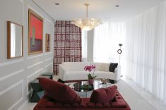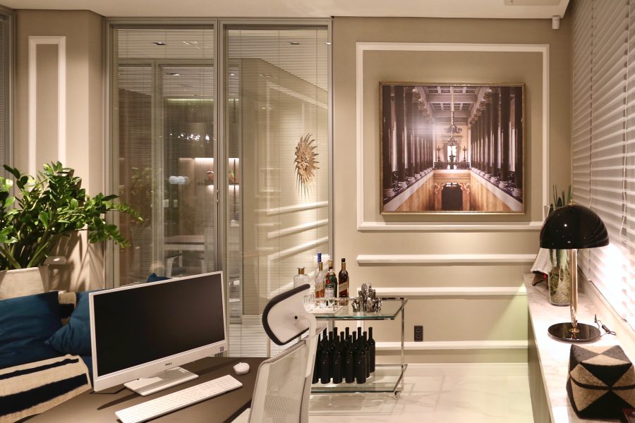 Para agradar ao estilo de alto padrão dos clientes da imobiliária, os sócios utilizaram produtos de luxo desde o acabamento às peças de decoração. O projeto teve a curadoria do artista plástico Eleuthério Netto, que trouxe objetos vintage, como a mesa antiga de mármore, luminárias em acrílico que foram usadas em cinemas de São Paulo nos anos 50 e o lustre Murado com pó de ouro dos anos 70. “Também utilizamos um mobiliário contemporâneo, como o sofá italiano e as cadeiras do design Gustavo Bittencourt, mostrando, sem extravagância, o alto padrão da empresa”, comenta Mutao. Os ambientes também foram compostos por peças da Funcional Móveis, com o apoio de um projeto luminotécnico que valoriza as peças e proporciona ainda mais sofisticação aos ambientes.