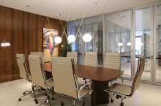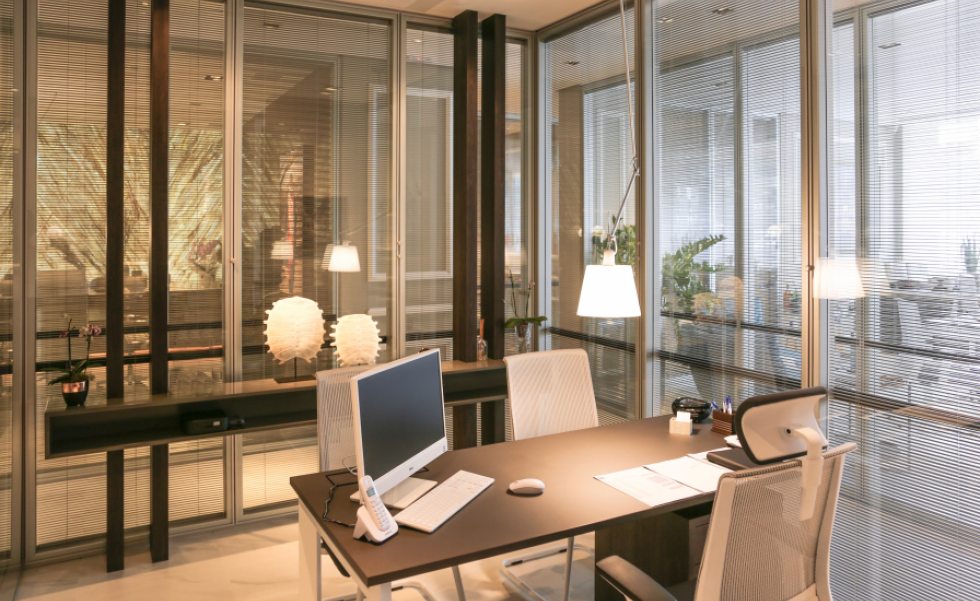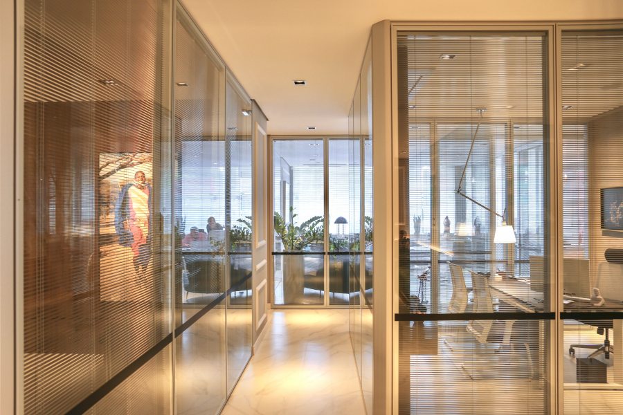 Além de atender ao público da imobiliária, os sócios também identificaram o estilo de cada um dos funcionários e sócios da empresa, com seus gostos e preferências, adaptando-os a cada ambiente. Outro diferencial significativo para o escritório foi a presença de apenas uma parede com entrada de luz natural, criando a possibilidade de divisórias entre os ambientes através de vidros com persianas, para que todas as salas permitissem a entrada de luz solar. “Além dos requisitos de atender a diferentes públicos, com funcionários apresentando estilos diferenciados, precisou-se criar ambientes que harmonizassem entre si, devido aos vidros transparentes nas divisórias das salas”, acrescenta o arquiteto Ary Jacobs.