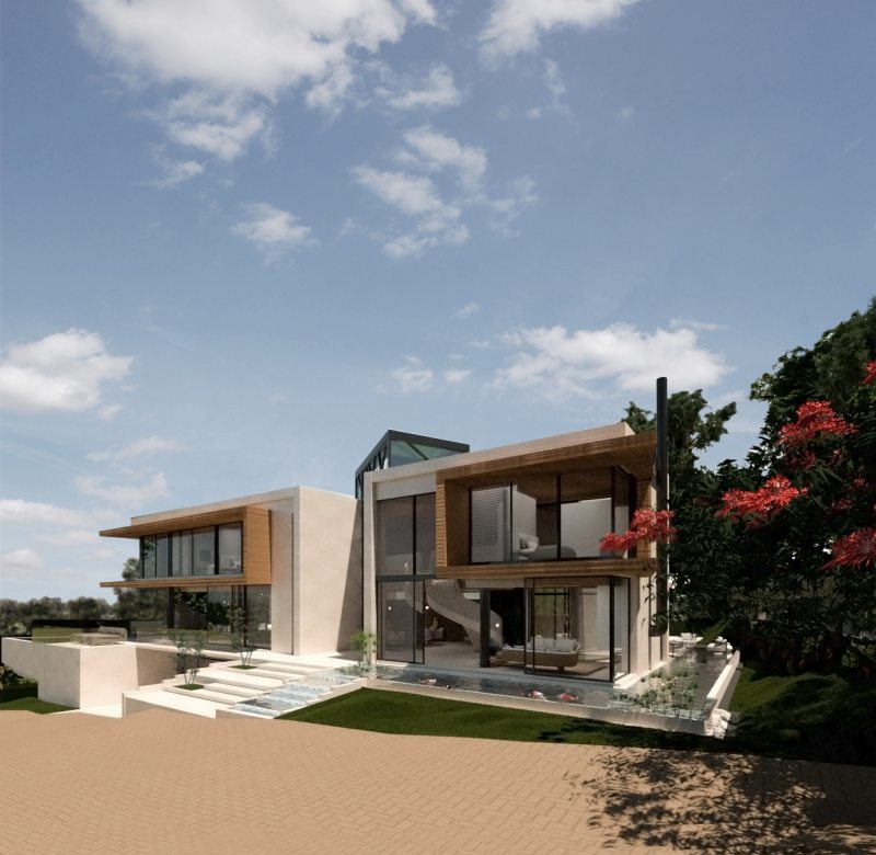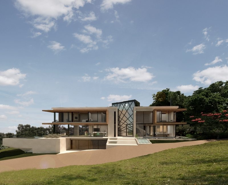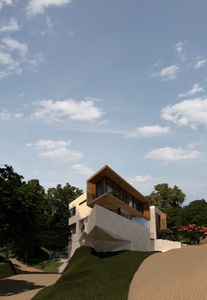 A casa de três andares e piso subterrâneo foi desenhada para um casal com dois filhos, que procuraram o escritório de Eliza na esperança de colocar seus sonhos em papel. “É uma família unida, que adora curtir momentos um com o outro e com amigos. O desejo deles era uma casa grande, com áreas de reunião e com tudo bem integrado à natureza. A família queria levar para a casa toda a brasilidade que temos em nosso país e cultura, em espaços para reunir, relaxar e apreciar a vista”, comenta a arquiteta. Após alguns estudos, foi desenvolvida uma proposta com formas puras, volumes visualmente interessantes e pontos focais dos estudos paramétricos, posicionando a casa para que ela ocupasse a maior parte do lote.