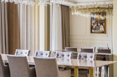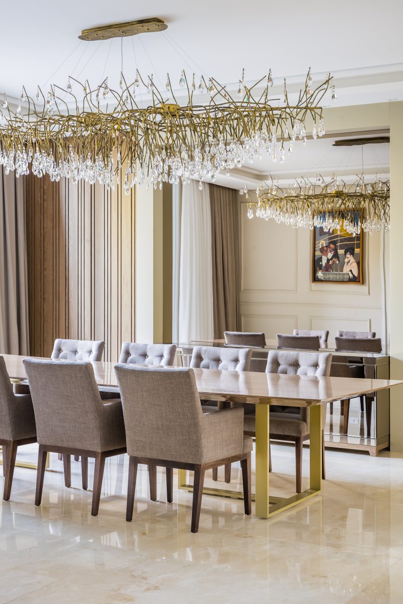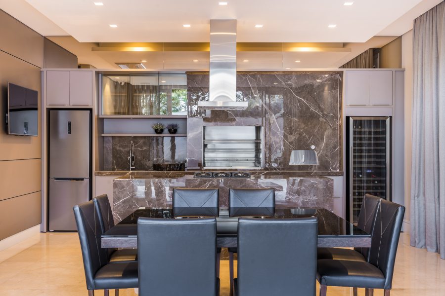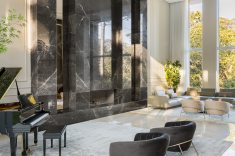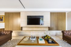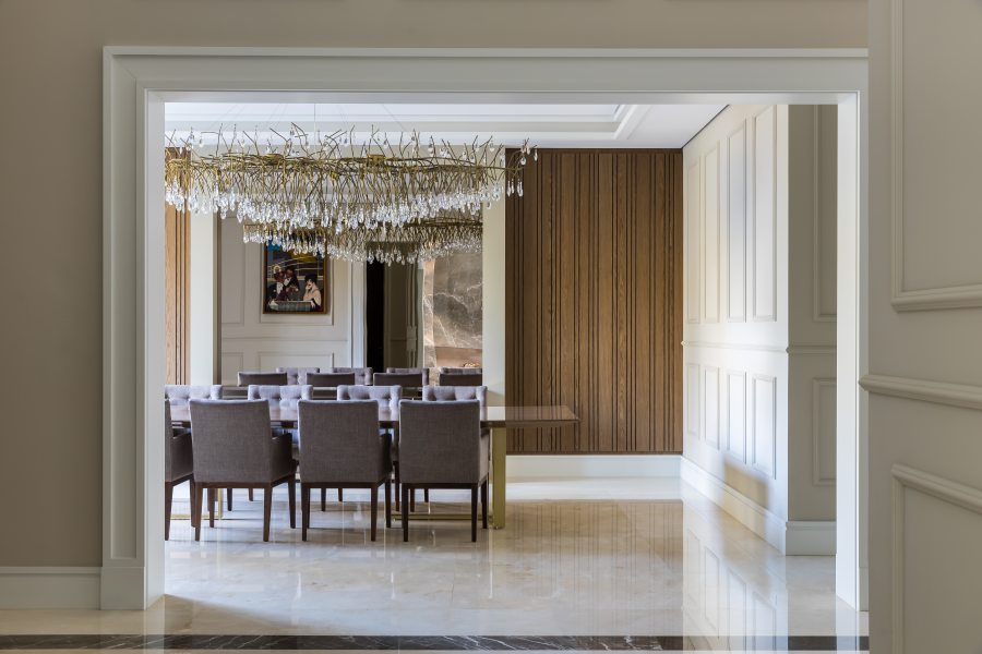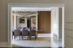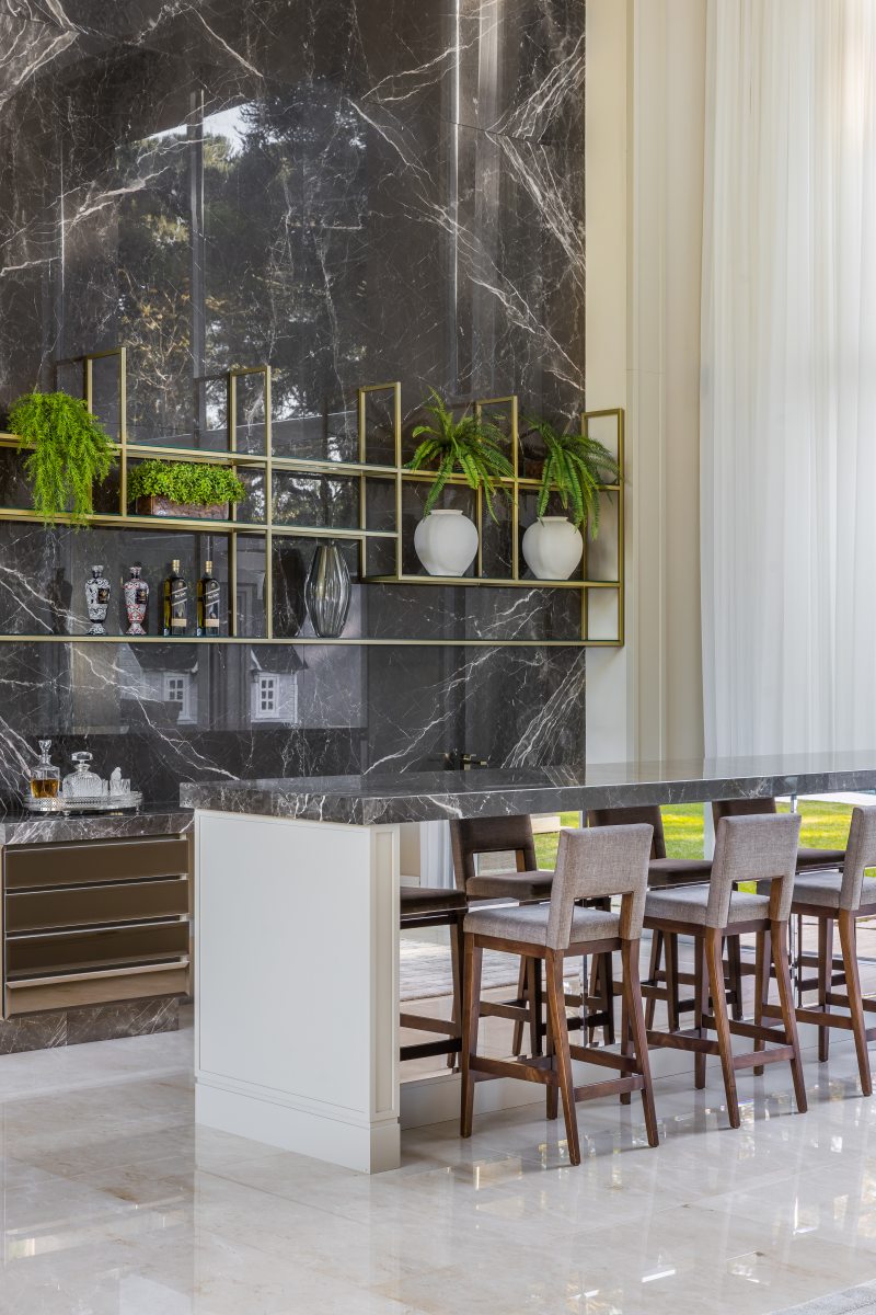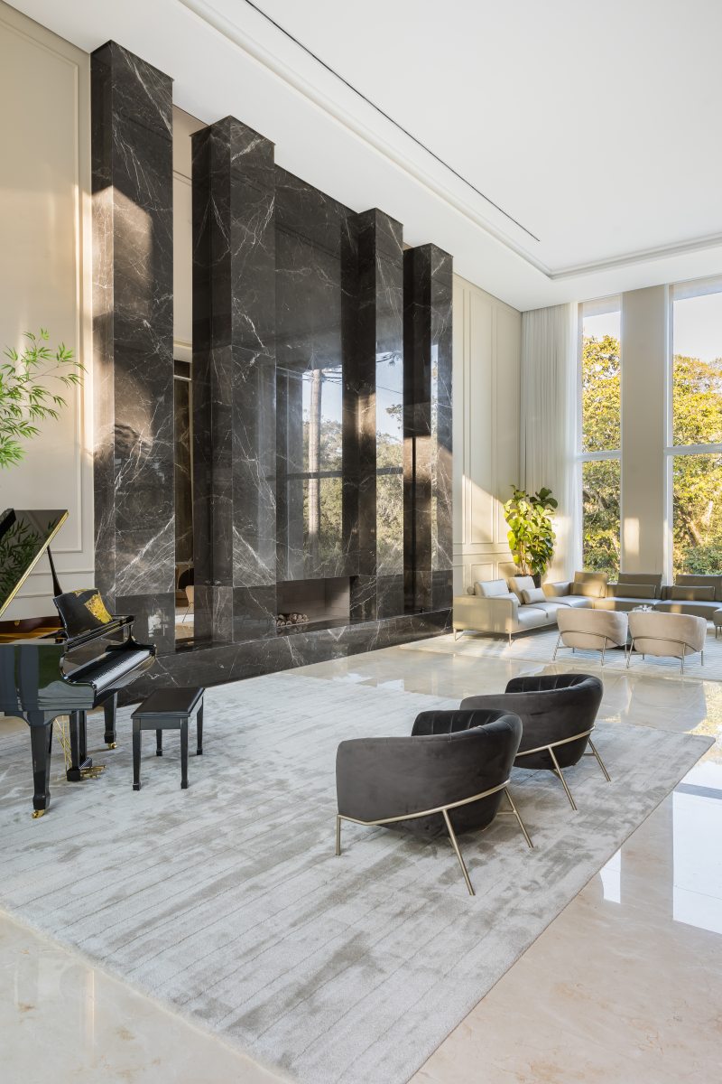 Na área social, situada em uma das extremidades da residência, os grandes vãos livres e o pé-direito duplo compõem o imponente espaço que inclui bar, sala de música, sala de estar e bistrô. A monumental lareira em mármore bronze Armani e as paredes de boiserie, combinadas a uma paleta de cores discreta, resultam numa atmosfera sofisticada que promete impressionar convidados.