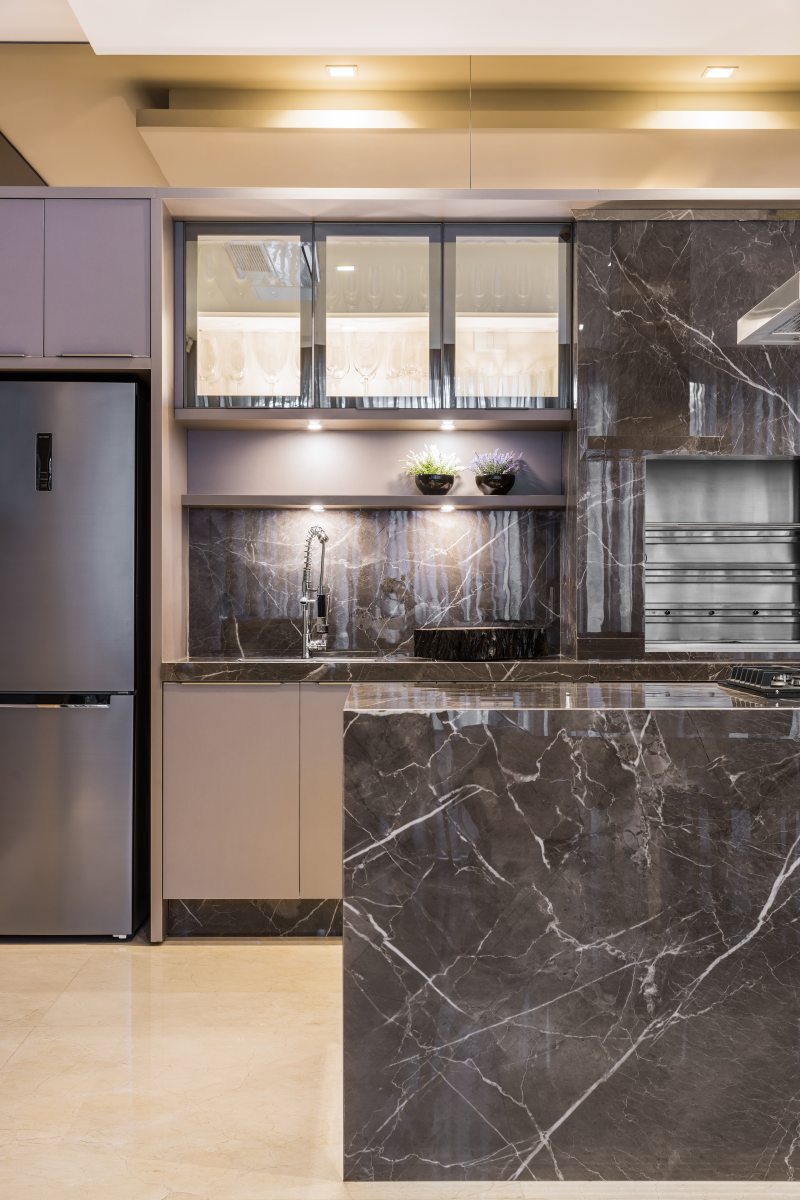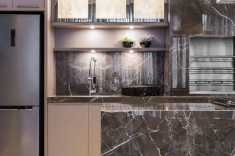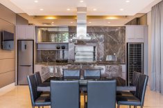 Pisos de mármore da NPK Mármores - Crema Marfil nos ambientes internos e Travertino Romano nos ambientes externos – resultaram numa composição interessante com os elementos amadeirados e iluminação acolhedora. A estrutura de apoio, composta por área de serviço com cozinha, lavanderia, área de apoio para funcionários, horta e garagem subterrânea (com dez vagas e área de apoio para motorista), completa os setores sociais da residência.