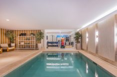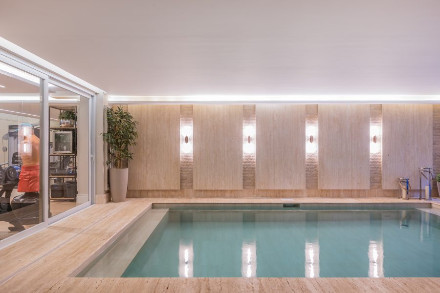 Para isso, os profissionais idealizaram uma área de lazer completa, que inclui sala de jogos, espaço fitness, jardim de inverno, sauna, piscina coberta e piscina externa com deck.